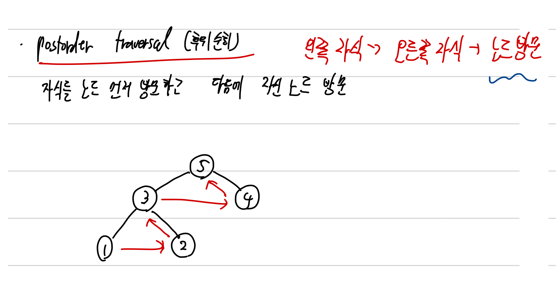 1. Preorder traversal (전위 순회): 노드 자신을 방문 -> 왼쪽 자식 노드 방문 -> 오른쪽 자식 노드 방문