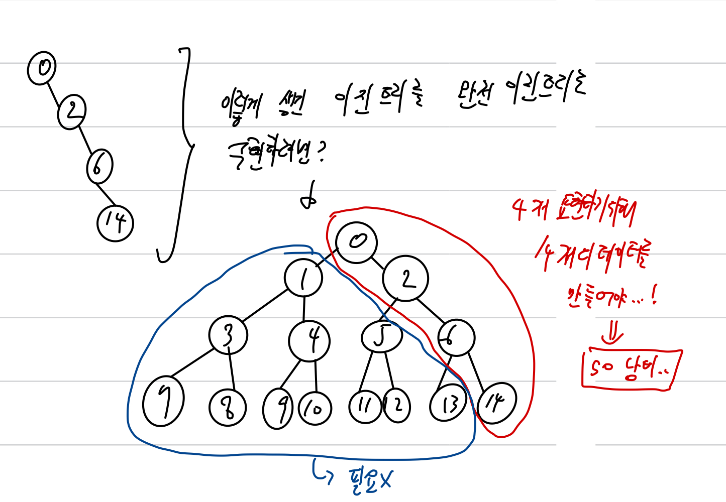 워낙 포인터가 어렵다고 하는데, 굳이굳이 이진 검색 트리를 포인터로 만들어야 할 이유가 있을까? 당연히 있다. 이진 트리의 경우, 힙 정렬(=완전 이진 트리)과 달리 완전 이진 트리의 형태가 아닌 경우가 더 많다. 예컨대 오른쪽 자식 노드로만 연결되어 있는 2 - 6 - 14 이런 케이스도 엄연히 이진 트리다. 그런데 이걸 완전 이진트리로 구현하게 되면? 쓸데없는 데이터가 덕지덕지 달라붙는다. 아래 예시 이미지를 보자. 0-2-6-14라는 이진 트리 하나를 완전 이진 트리로 구현하기 위해서는 0부터 14까지 전혀 필요없는 데이터까지 만들어줘야한다.