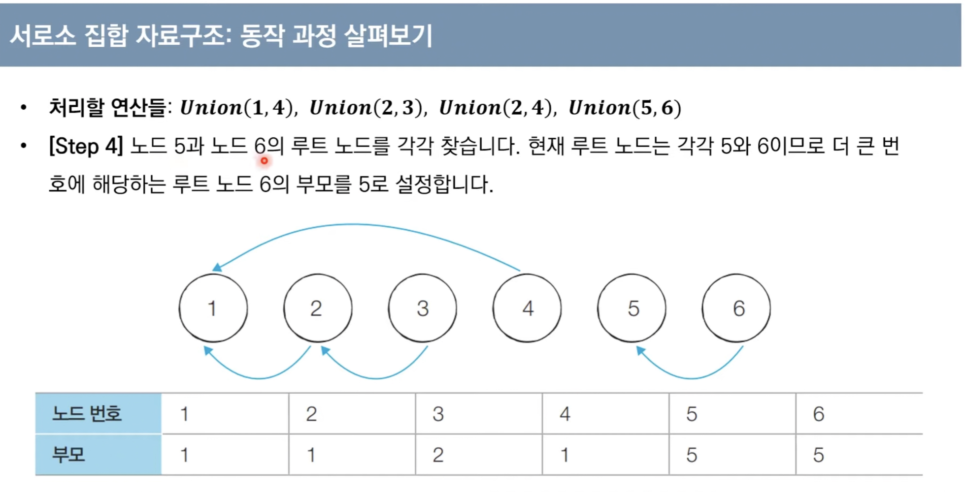 이렇게 유니온 연산으로 {1,2,3,4}, {5, 6} 두 집합이 만들어진다. 여기서 이 두 집합은 어떤 원소도 서로 공유하지 않으니 서로소이다.