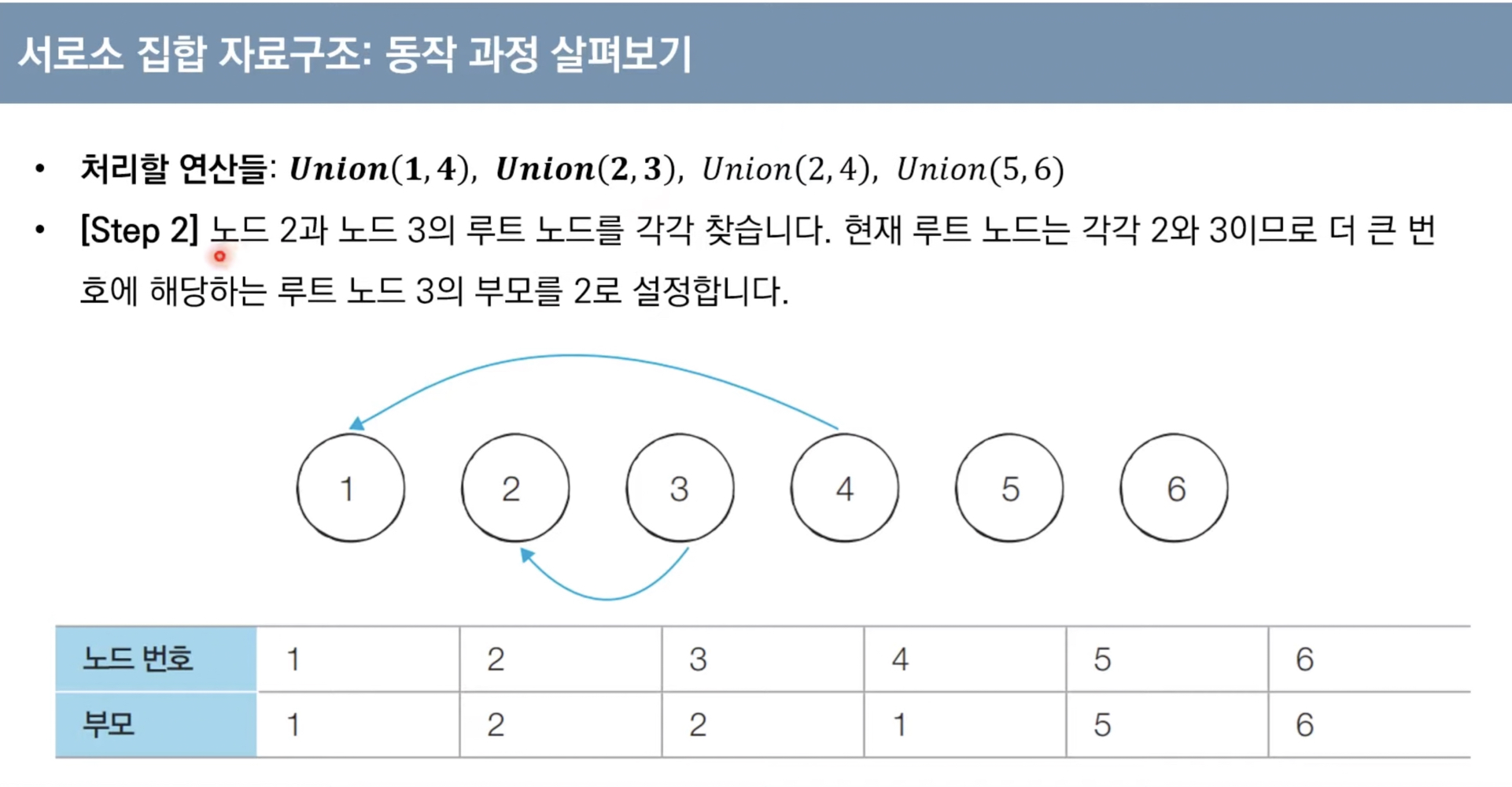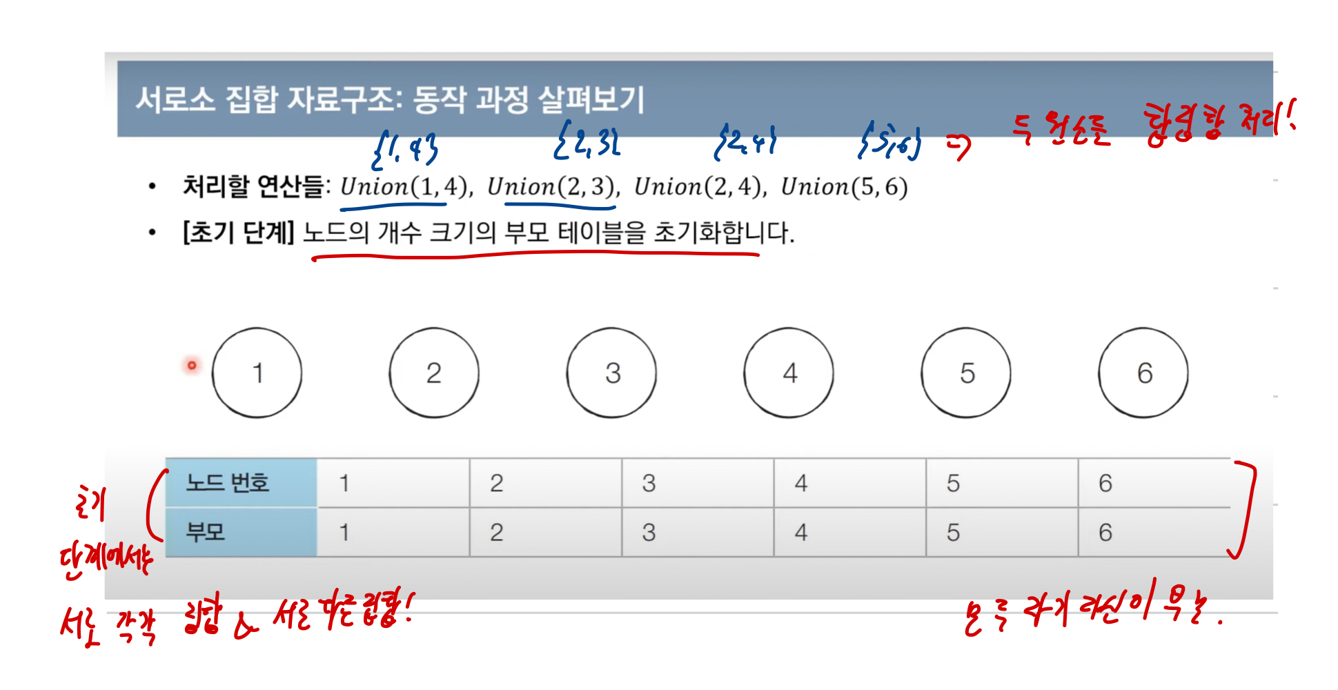 - 합집합으로 합치기(Union): 두 원소가 포함된 집합을 하나의 집합으로 합치는 연산