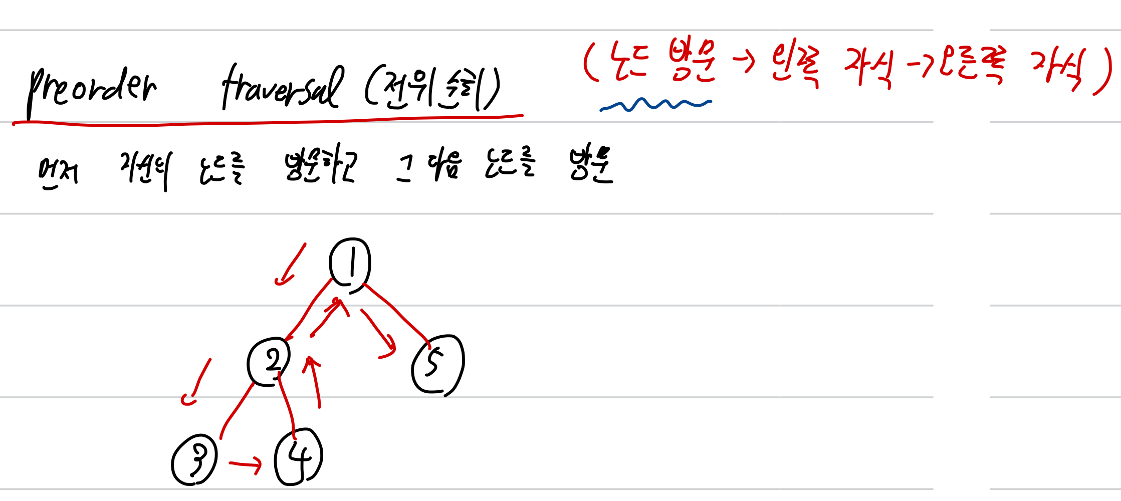 먼저 자기 자신을 처리한 다음, 왼쪽 자식 노드를 방문하고 뒤이어 오른쪽 자식 노드를 방문하는 순서로 이어진다. 자기를 처리하고 나서 왼쪽 자식 노드를 방문하면, 그 시점을 기준으로 왼쪽 자식노드는 자기 자신이 되고 이떄의 자신을 기준으로 자신 -> 왼쪽 자식 노드 -> 오른쪽 자식 노드를 방문하는 순서가 반복된다. 즉, 재귀를 활용하면 된다는 뜻이다.