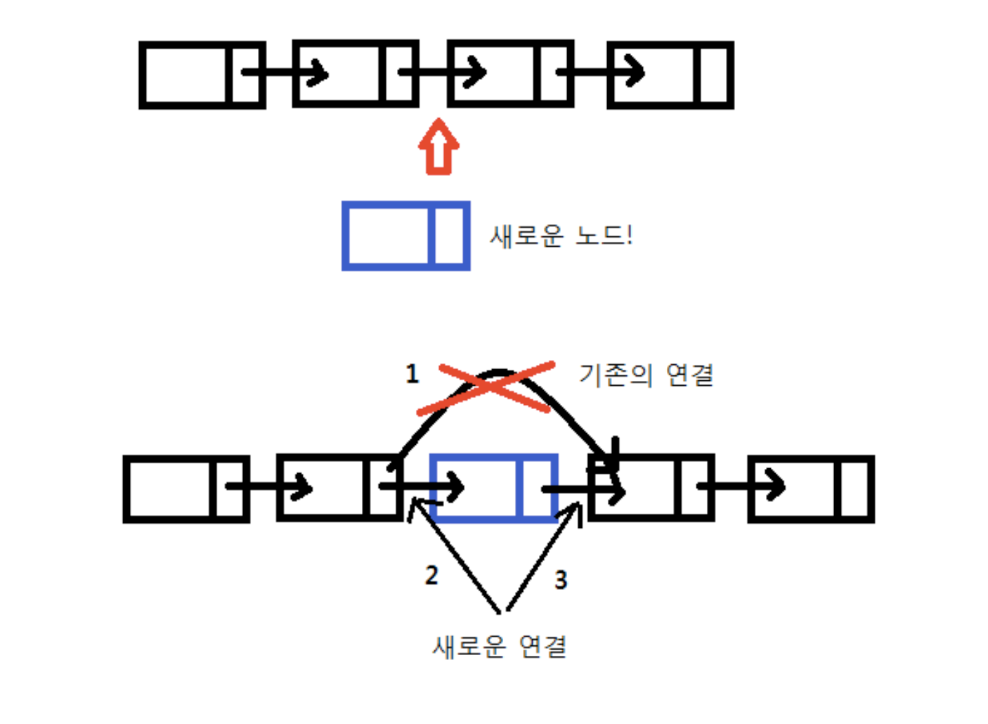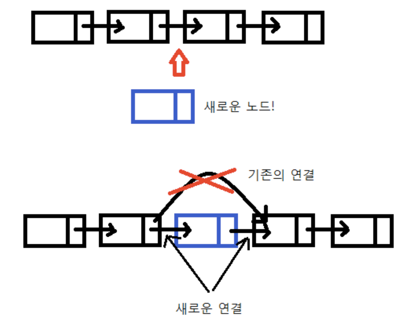 뿐만 아니다. 기존 배열에서는 거의 불가능했던 작업인 "배열 중간에 새 원소 집어넣기"가 가능해진다. 즉, 노드 사이에 새로운 노드를 끼워 넣을 수 있게 된다.
