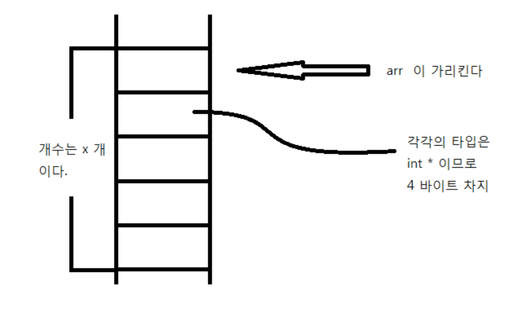 그래서 arr은 포인터 사이즈에 해당하는 4바이트 크기의 방을 x 개만큼 힙에 동적으로 할당한다.