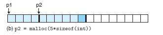 근데 그림에서 실제로는 p2의 마지막 칸에 진한 하늘색이 칠해져있다. 이건 비어있다는 뜻인가? 놉. 이 역시 p2의 일부이다. p2는 int 사이즈로 5칸을 요청했으나 현재 작업하는 컴파일러가 32비트 모드이기 때문에 할당기 주소는 8바이트의 배수에 맞게 배치되어야 한다. 하지만 현재 전체 블록 크기는 int 사이즈 4바이트 * 5= 20 바이트로, 한 칸을 더 붙여줘야 24바이트로 8의 배수가 된다. 이렇게 실제 데이터에는 들어가지 않으나 블록 사이즈를 조정하기 위해 추가적으로 덧대는 블록을 padding이라고 한다.