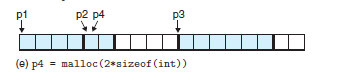 위 그림에서 진한 하늘색으로 칠해진 영역이 비었다고 생각하고 보자. 현재 할당된 블록은 검은색 경계가 칠해진 6칸짜리 블록인데 p2에서 실제로 데이터가 들어가는 영역(payload)은 int 사이즈로 5칸이다. 따라서 이 경우에는 할당된 블록의 공간을 전부 사용하지 않으니 내부 단편화가 일어난다.