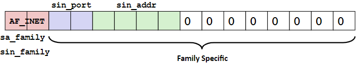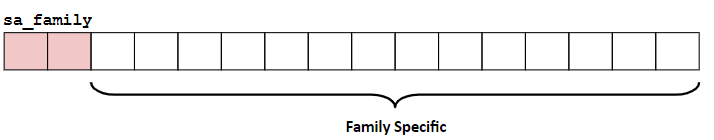 sockaddr의 구조를 살펴보자. 아래와 같이 2칸은 이 소켓의 종류가 무엇인지를 말해준다. 예컨대 이 소켓이 TCP인지 UDP인지 IPv6인지 등이다. IPv4는 없는데, 이는 워낙 많이 쓰다보니 아래와 같이 sockaddr_in이라고 해서 전용 구조체를 따로 가진다.
