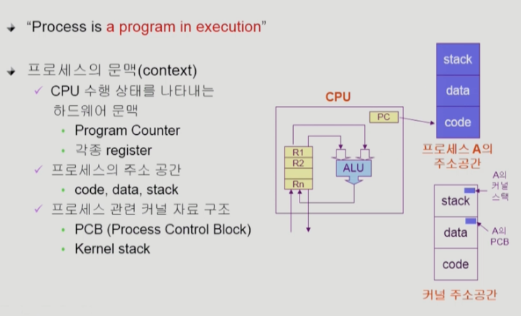- monitor mode: 시스템 콜, 인터럽트, 등 ⇒ 운영체제 코드를 실행 중일 것. 이때는 프로세스가 CPU를 잃고 운영체제가 CPU를 얻어서 운영체제가 running하고 있다고 말하지 않음.