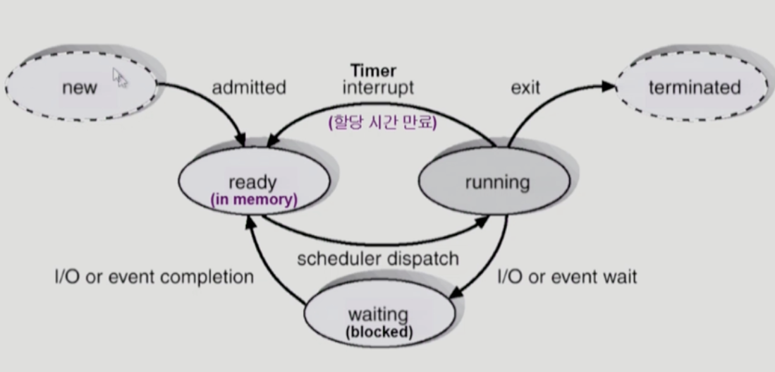 이쯤에서 thread의 상태도(아래 이미지)를 보자. thread_yield()는 현재 스레드를 ready_list 맨 뒤에 줄세운 다음 상태를 running에서 ready로 바꾼다. (do_schedule()은 현재 스레드를 인자로 받은 상태로 바꾸고 ready_list에서 기다리던 그 다음 스레드를 running으로 바꾼다. 즉, 두 스레드의 상태를 샤샥 바꾸는 함수) 얘기가 길어지는데 양해 부탁,,