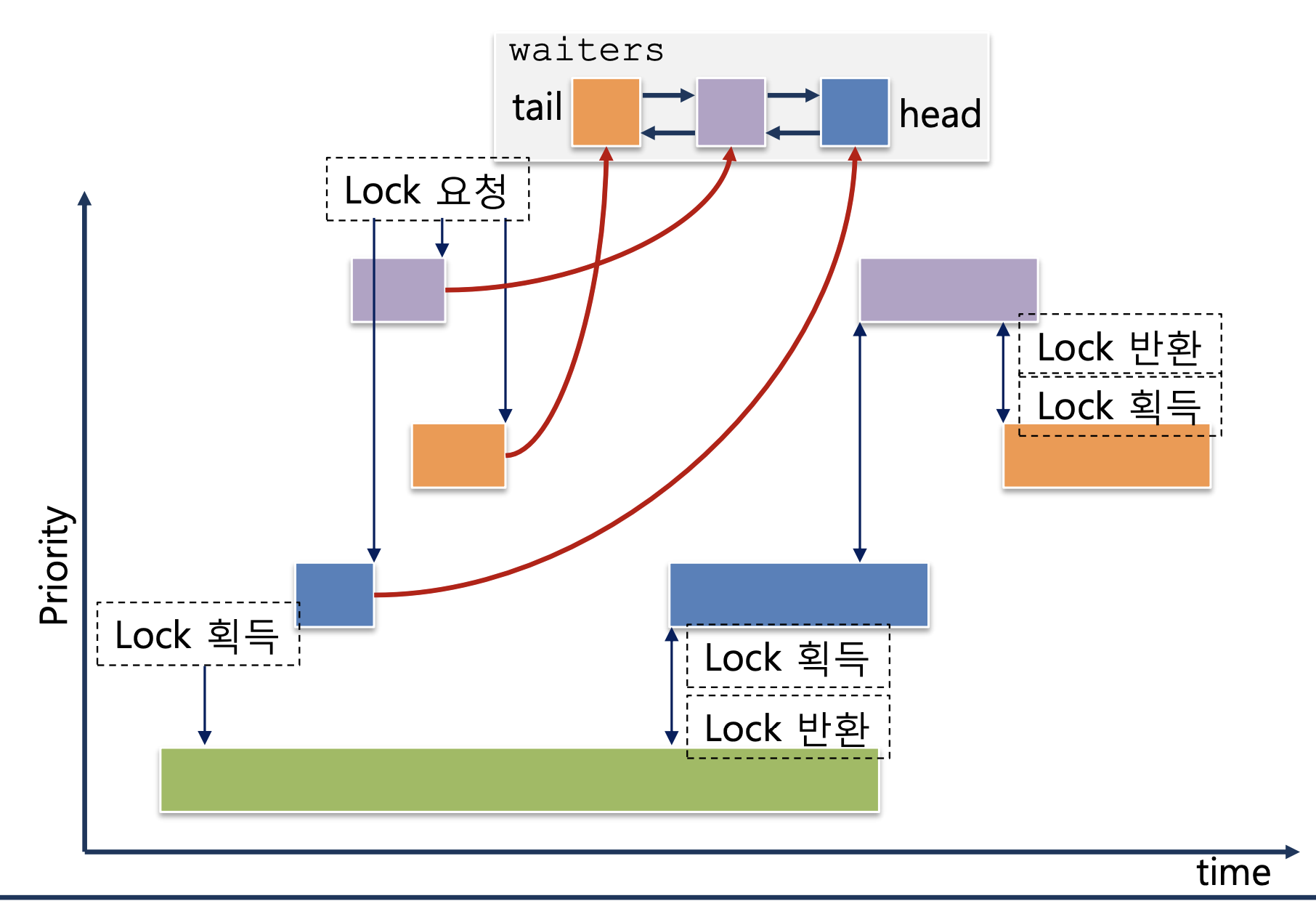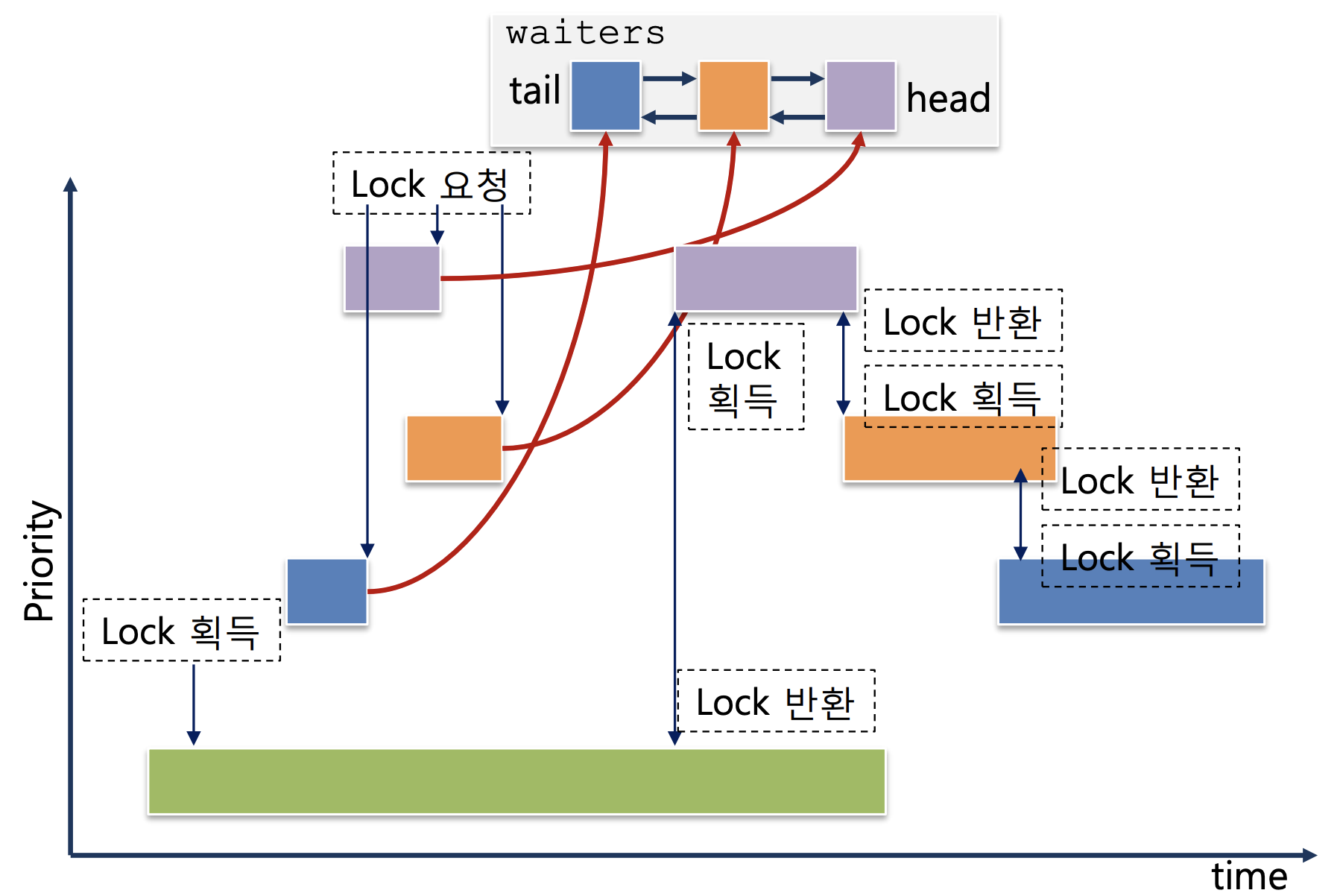 공통 부분부터 보자. 가장 아래 연두색 블록이 처음 lock을 받는다. 연두색 블록이 들어오는 시점을 기준으로는 이외에 어떤 블록도 없기 때문이다. 이후에 들어온 파란색 블록이 lock을 요청한다. 이때까지만 해도 waiters에는 동일하다. 이제 그 다음 블록인 연보라 블록부터 상황이 달라지는데, 왼쪽의 FIFO에서는 우선순위를 전혀 고려하지 않으니 자연스럽게 head 블록인 파란색 다음으로 연보라가 온다. 하지만 오른쪽 이미지에서는 Priority를 고려하기 때문에 head 블록으로 연보라가 오고 파란색 블록은 tail로 밀려난다. 그 다음 역시 왼쪽은 무조건 tail에 붙고 오른쪽에서는 우선순위를 고려해 적절한 위치를 찾아간다. 어디서 많이 보지 않았나? 바로 과제 1.2에서 썼던 list_insert_ordered()가 여기서도 쓰일 것이라는 게 보인다.