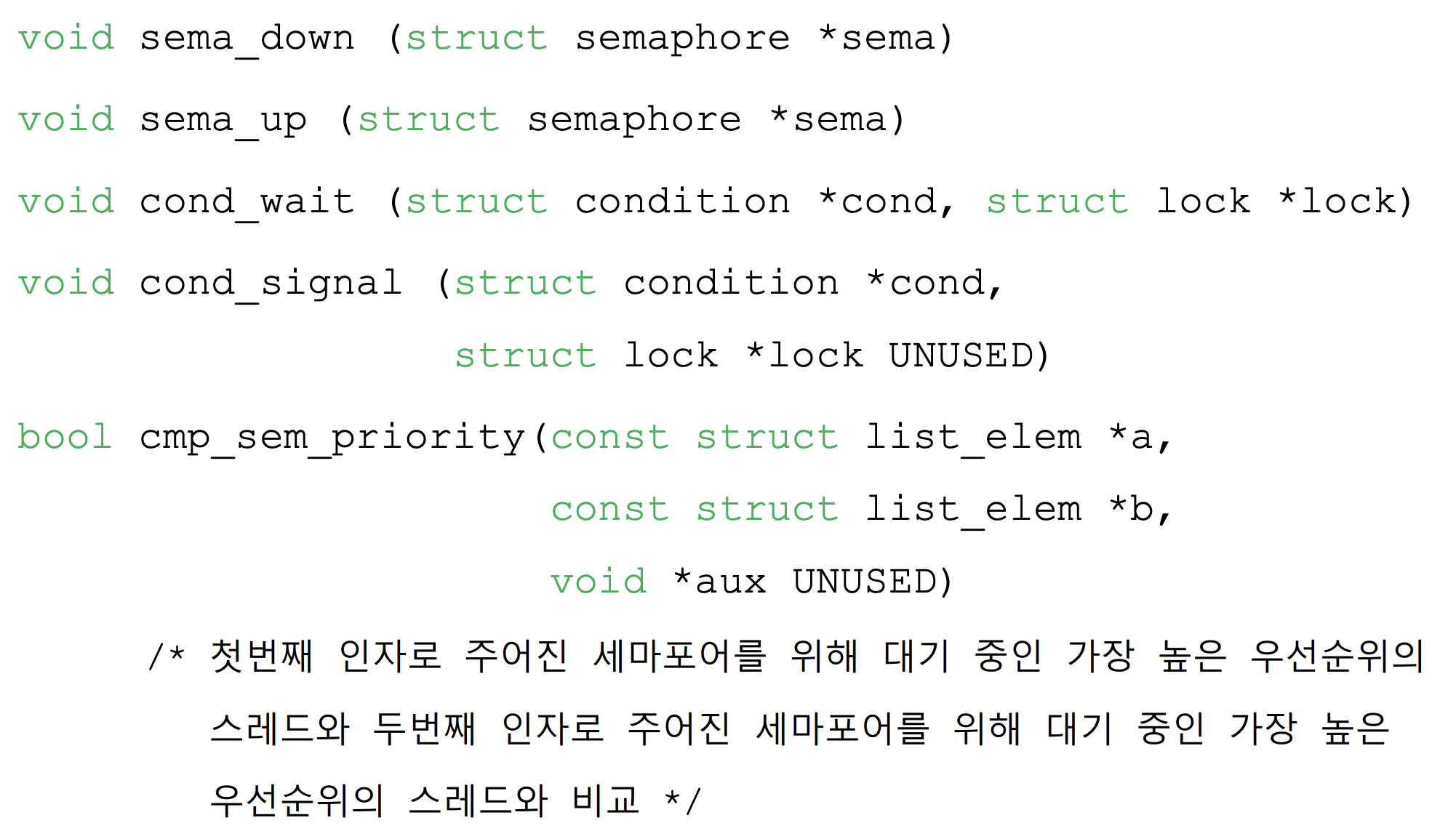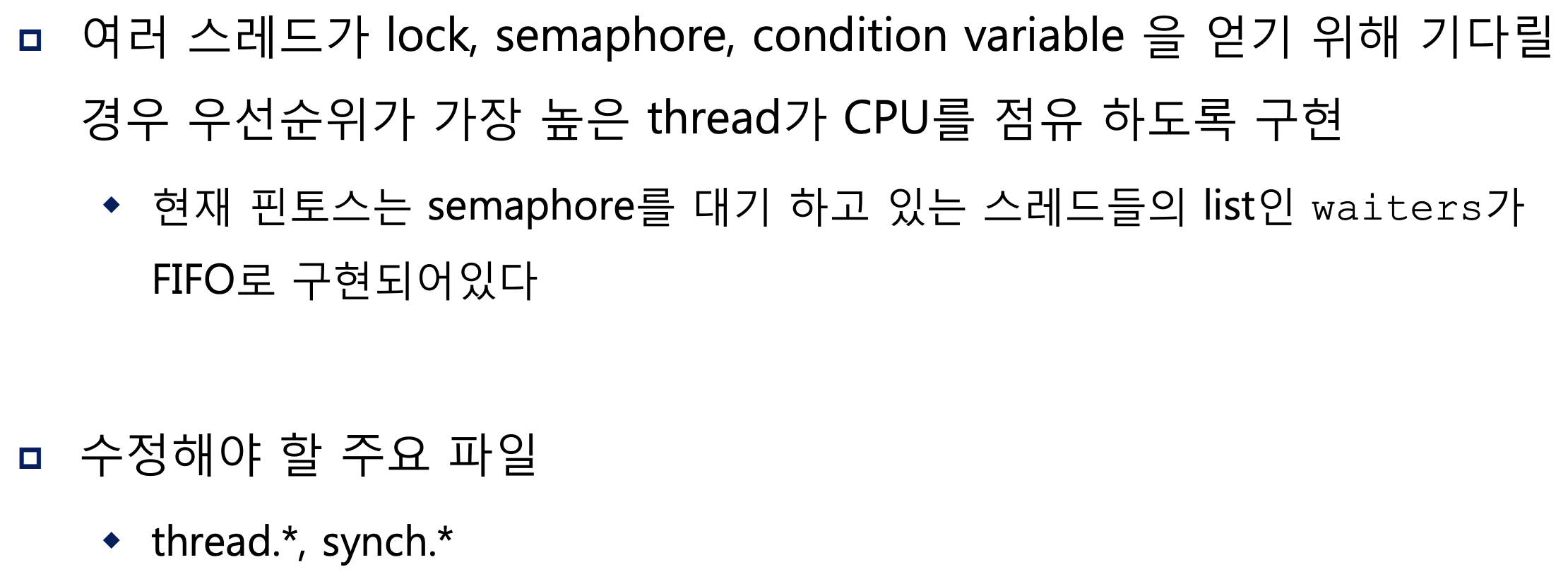 어떤 프로세스가 모니터 안에서 작업하다가 조건이 충족되지 않아 기다려야 한다면? 프로세스를 재운다. 이때, 어떤 조건이 충족되지 않아서 잠들었는지, 그 해당 조건을 변수로 둘 수 있는데 이것이 condition variable이다. 핀토스 상에서는 condition variable에 대한 인자를 받기는 하나 어떤 조건에 대한 변수인지를 받는지는 나와있지 않다. 즉, 어떤 상태로 잠들었는지는 여기서는 알 수 없으나 wait과 signal 함수로 condition 구조체 안에 정의되어 있는 waiters list 멤버 안에 스레드를 줄세운다. 이때, 아래 구현 파트에서 cond_wait()와 cond_signal()을 수정해 FIFO가 아닌 우선순위 순서로 삽입하도록 수정한다.