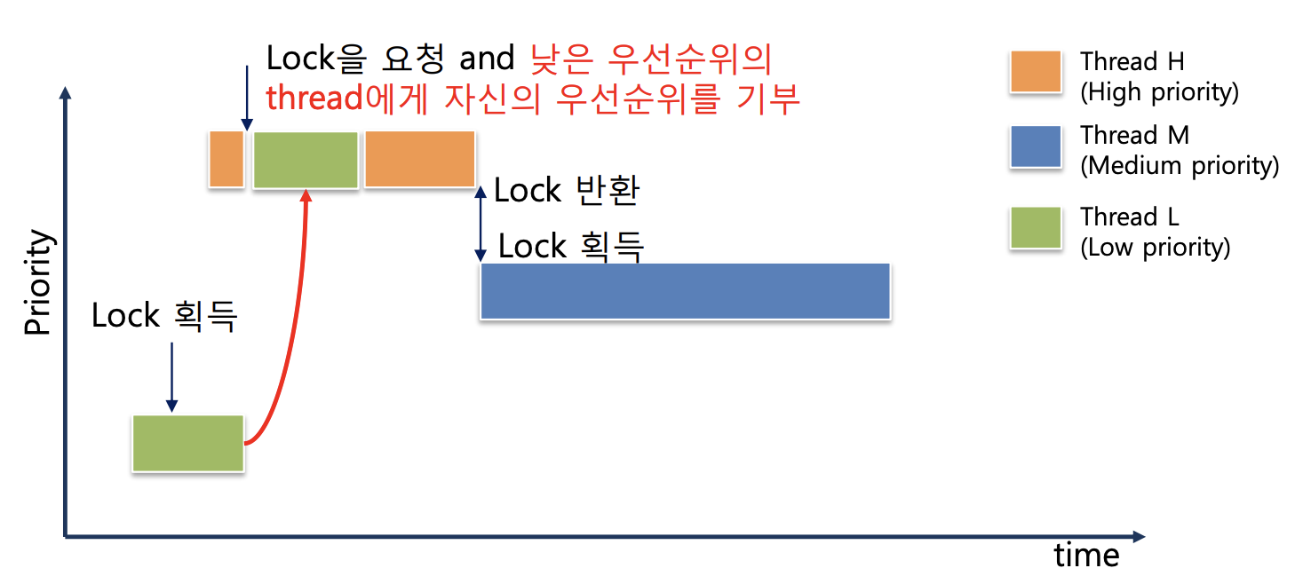 이러한 문제를 해결하기 위해서는, 주황이가 Lock을 요청할 때 연두한테 자기의 우선순위를 빌려주는 것이다. 그러면 연두는 우선순위가 높아져서 파랑이한테 우선순위를 빼앗기지 않고 작업을 완료할 수 있으며, 작업이 끝나면 자연스럽게 주황이가 뒤를 이어 CPU를 잡고 작업을 진행할 것이다. 그 작업이 끝나고서야 중간 단계의 우선순위인 파랑이가 CPU를 잡는다. 이러면 모두가 해피엔딩!