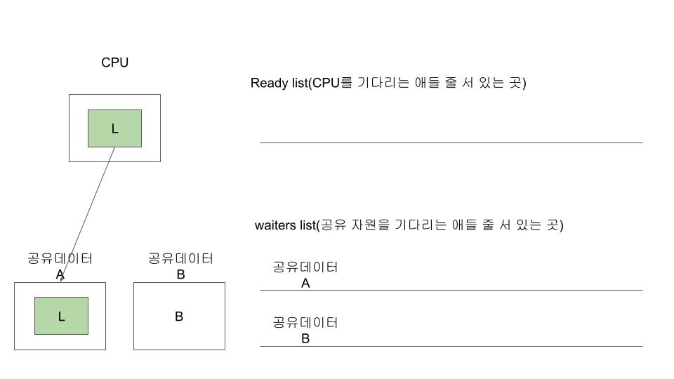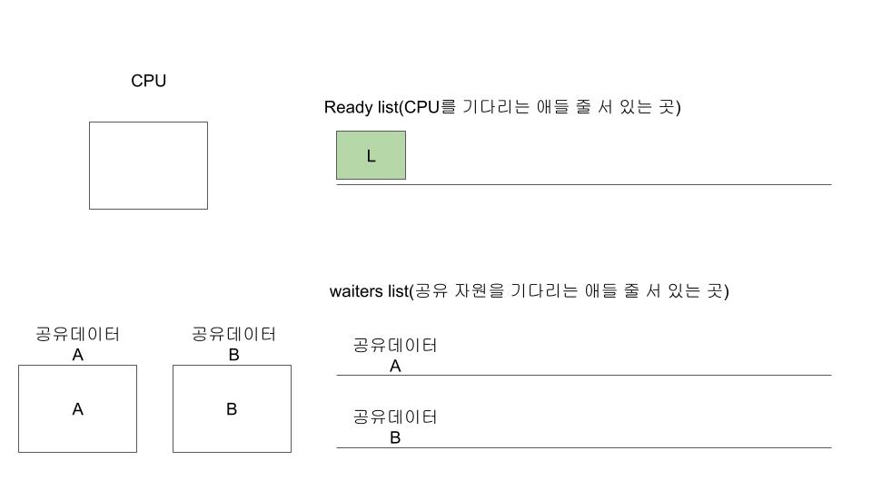 더 큰 비극은 아래와 같은 상황이 닥쳤을 때다. 공유 데이터 B를 잡기 위해 파랑이의 친구들이 차례대로 ready list에 줄서기 시작했다.