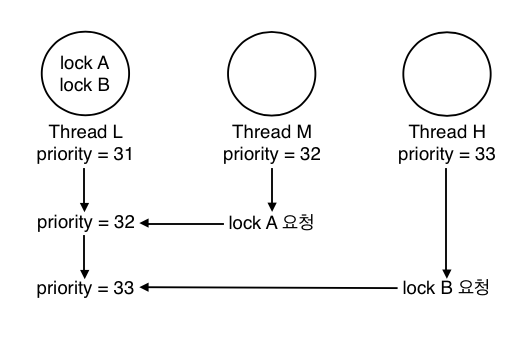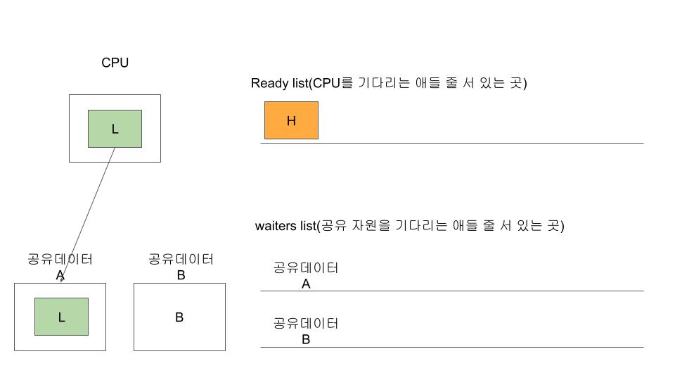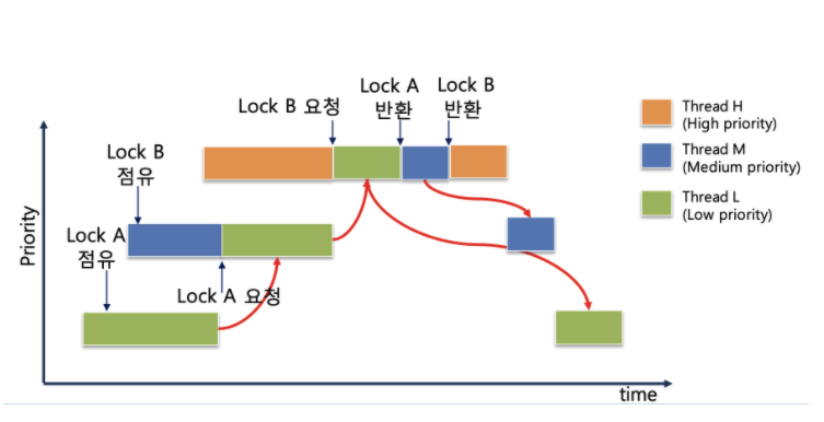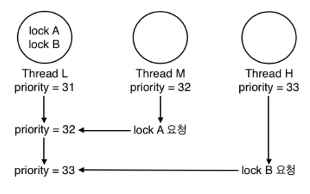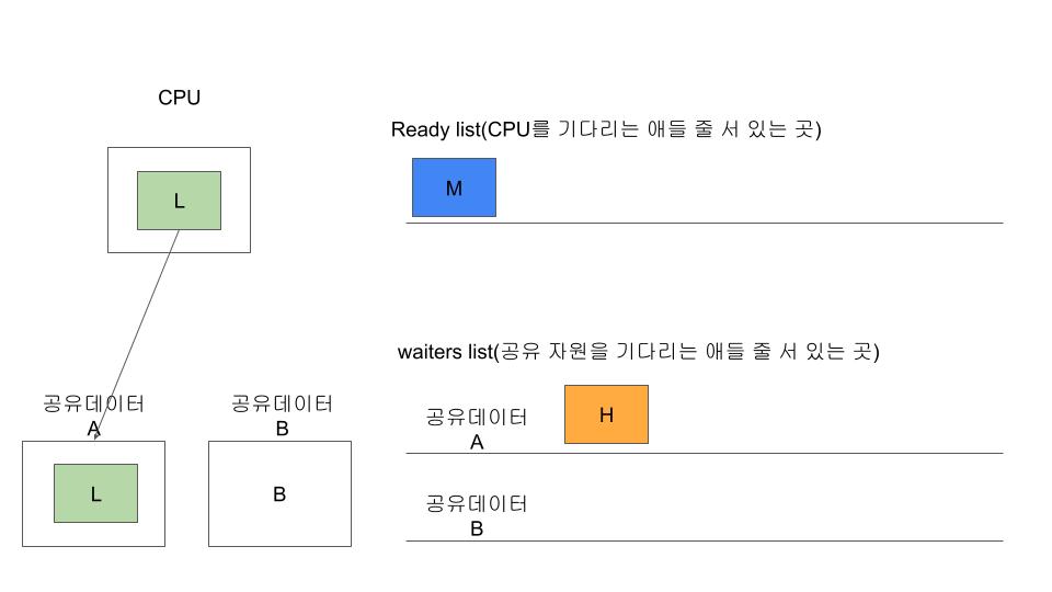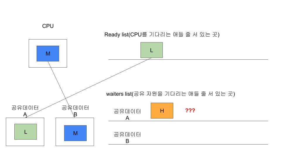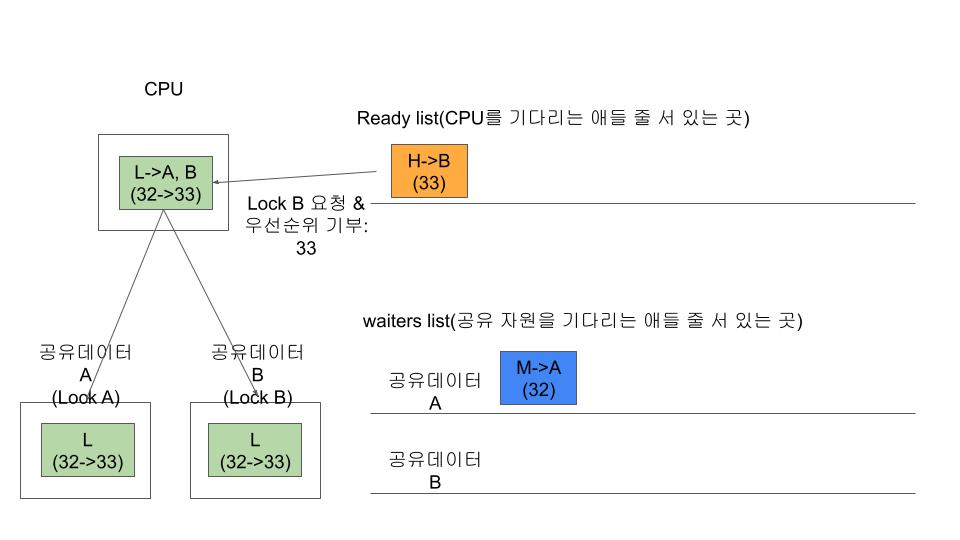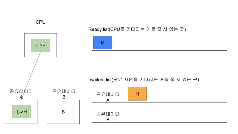 그 사이에 H가 들어온다. H는 처음에 아무런 Lock도 요청하지 않았기에 바로 CPU를 잡고 작업을 한다. 그러다 중간에 Lock B를 요청하는데, Lock B는 M 스레드가 잡고 있었다. 하지만 M 스레드는 Lock A를 요청하고 기다리던 상황이었기 때문에 M 스레드가 H한테 Lock B를 넘겨주기 위해서는 가장 먼저 L 스레드가 Lock A를 반환해야 이 순환고리가 끝이 난다. 따라서 M과 L 둘다 H의 우선순위를 물려받는다.