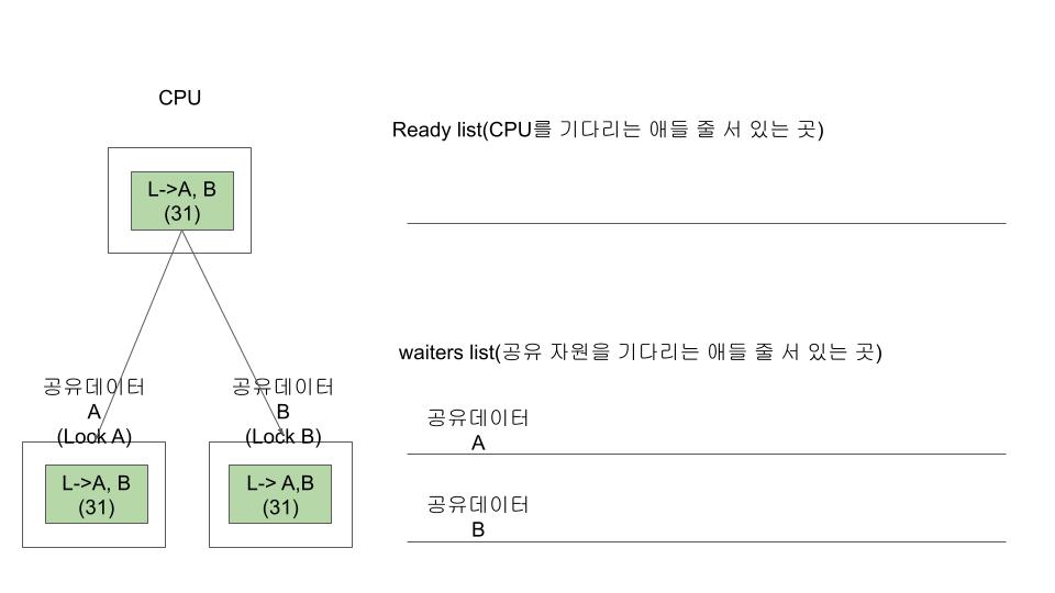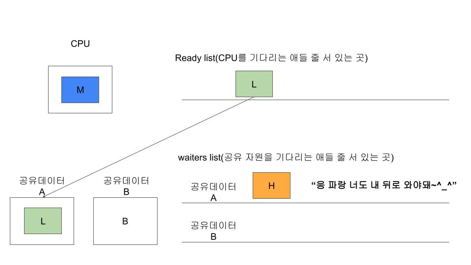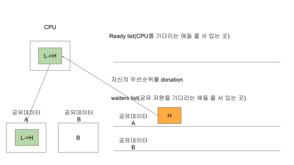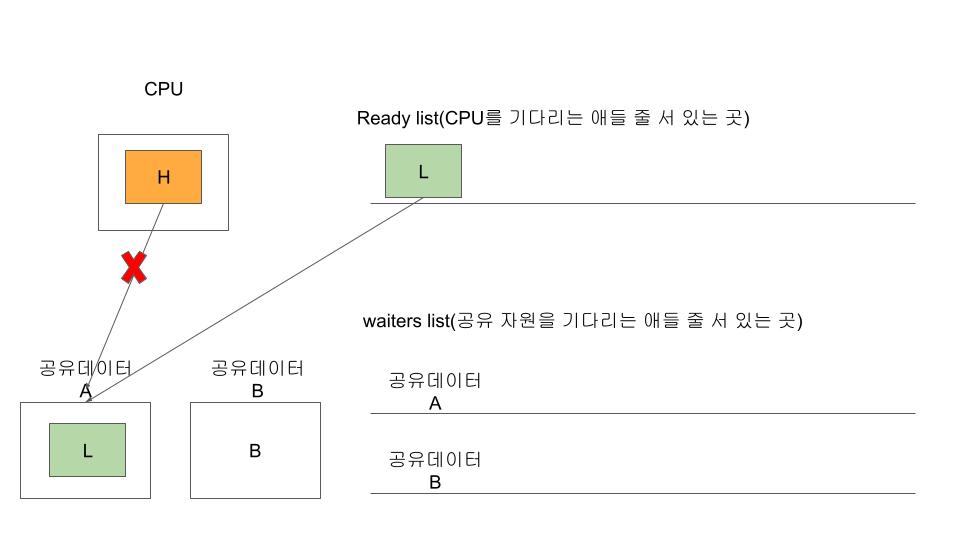 우리는 이미 앞 과제에서 priority 기반으로 CPU를 선점하는 기능을 추가했기에 주황색이 CPU 우선순위가 높아 CPU를 연두색으로부터 빼앗아 오고 연두색 스레드는 ready list로 밀려난다. 하지만 CPU 점유와 별개로 공유 자원에 대한 접근 권한은 연두색 스레드가 갖고 있다. 따라서 주황색 스레드는 자원을 기다리기 위해 waiters 리스트로 들어간다.