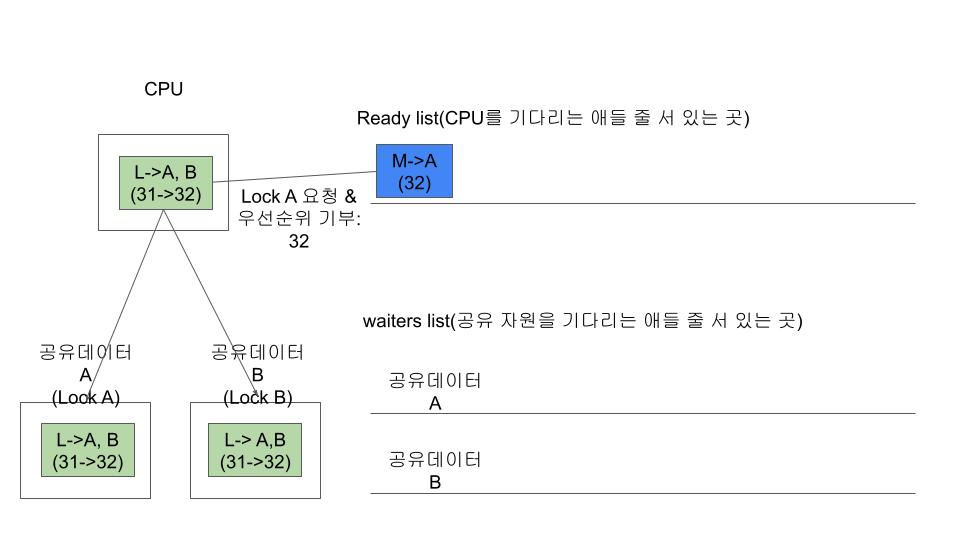 이때, 더 높은 우선순위(32)를 갖는 M이 와서 Lock A를 요청한다. 중간에 CPU를 점했다가 다시 내어주고 waiters list로 가는 과정은 아래 그림에서 생략했다. waiters list로 갈텐데, 그 전에 우선순위를 기부한다.
