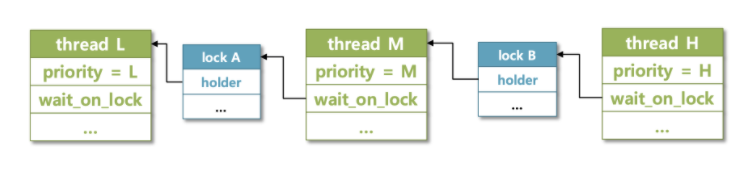 이번에는 위와 비슷하면서도 약간 다른 개념이다. 위에서는 L 스레드에게 M, L이 각각 자신의 priority를 기부했다. (M->L, H->L). 이와 달리, Nested donation은 마치 체인처럼 H, M, L이 서로 연결되어 우선순위를 기부하는 상황이다. (H-> M -> L)