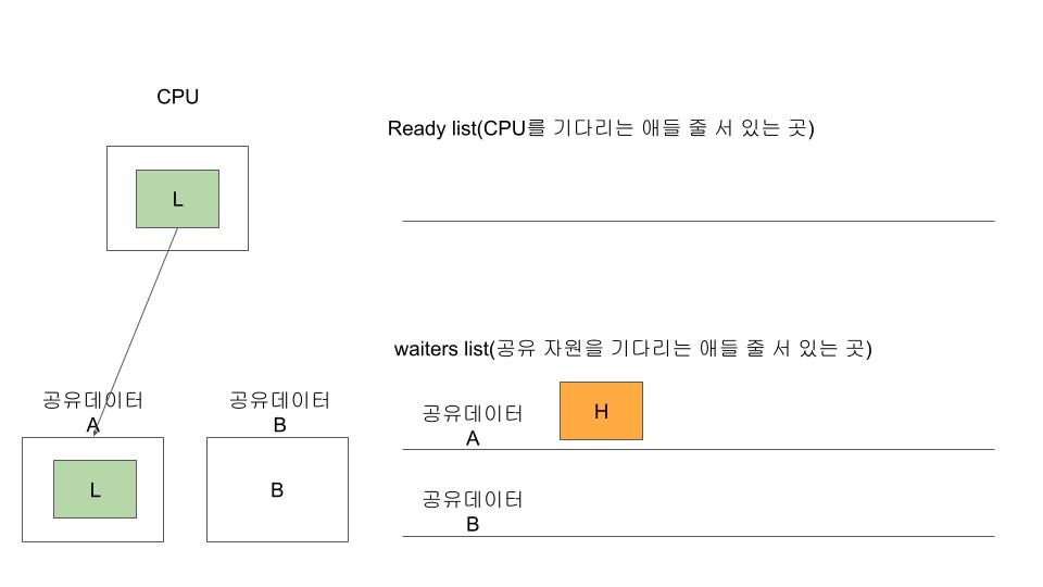 괄호 안의 숫자는 우선순위이며, 화살표는 갖고자 하는 lock을 뜻한다. 가장 낮은 우선순위를 갖는 L 스레드(31)는 Lock A, B를 모두 필요로 하는 스레드이다. 이 친구는 가장 먼저 왔기 때문에 두 자원을 갖고서 작업을 진행 중이다.