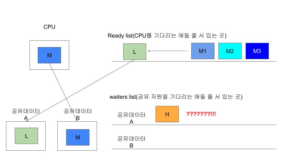 이어서 M이 Lock A를 요청한다. 그러면 donation이 일어나 L의 우선순위가 M과 동등해진다. 여기서 lock A는 L이 잡고 있었으니 CPU 제어권은 L에게 넘어오고 L 이 작업을 시도할 것이다.