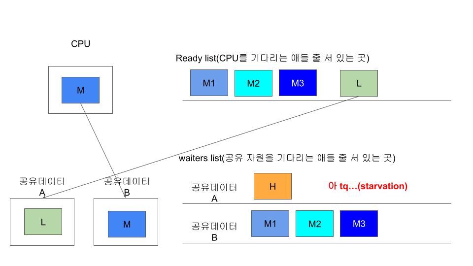 얘네들의 우선순위는 연두보다 높은 중간 단계이니 우선순위 기반으로 줄을 재조정해 자연스럽게 새치기를 한다.(ㄱㅅㄲ들..)그리고 얘네들은 공유 데이터 B를 점하기 위해 줄섰으니 맨 첫번째 파랑이가 작업을 끝내면 계속해서 공유 데이터 B를 기다리고 있는 중간 단계 우선순위 애들이 작업을 진행할 것이다. 따라서 주황이는 작업이 계속 밀리게 되고 어쩌면 영영 작업을 하지 못하는 상태(starvation)이 발생할 수도 있게 된다.