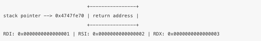 이 calling convention에서 정의하는 것 중 하나가 argument passing과 stack frames이다(참고자료 2에 잘 나와있음). 어떻게 함수 인자를 전달하고 반환값을 받아오냐를 관리하는데, x86-64 리눅스에서는 6개의 함수 인자가 레지스터 %rdi, %rsi, %rdx, %rcx, %r8, %r9로 전달된다. 만약 7개 혹은 그 이상의 인자가 들어오면 스택으로 들어간다. 그리고 반환값(return value)는 레지스터 %rax로 전달된다.