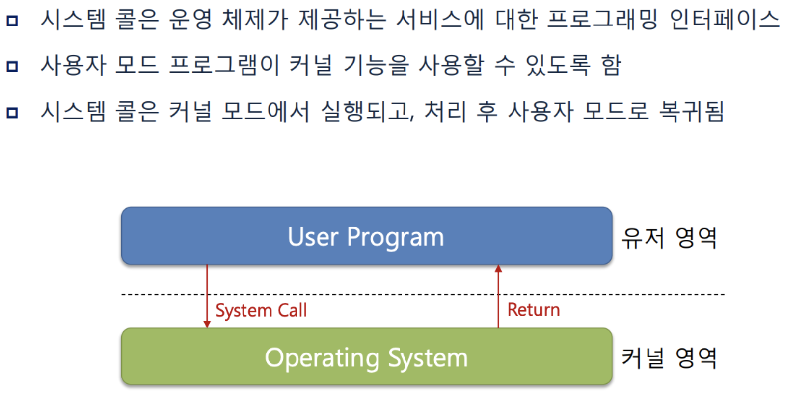 따라서 OS의 중요한 부분은 숨기고, 인터페이스만 제공해 유저 프로그램이 OS에 쉽게 접근하면서도 OS의 보안을 유지할 수 있도록 하는 장치 인터페이스가 바로 시스템 콜이다. 쉽게 말해 유저 프로그램이 커널 기능을 쉽게 이용할 수 있도록 하는 인터페이스이다. 유저 프로그램은 평상시에는 커널 영역에 접근하지 못하다가 커널 영역에 접근해야 할 일이 있을 때(I/O 접근이라던지 등) 시스템 콜을 호출한다. 그러면 커널 영역이 작업을 수행하고 반환값을 유저 프로그램에 전달한다.