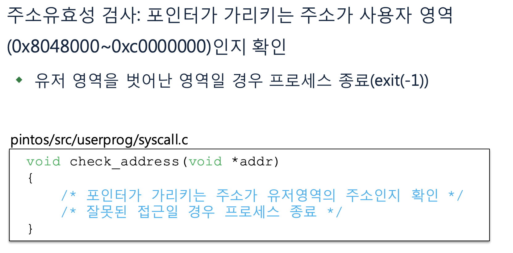 앞서 설명했듯, Gitbook에서 시스템 콜 과제 이전에 나오는 User memory access는 이후 시스템 콜 구현할 때 메모리에 접근할 텐데, 이때 접근하는 메모리 주소가 유저 영역인지 커널 영역인지를 체크하라는 과제이다. 이는 한양대 핀토스 pdf 시스템 콜 과제에 있는 check_address()에 해당하므로 이 함수부터 구현하고 시작한다.