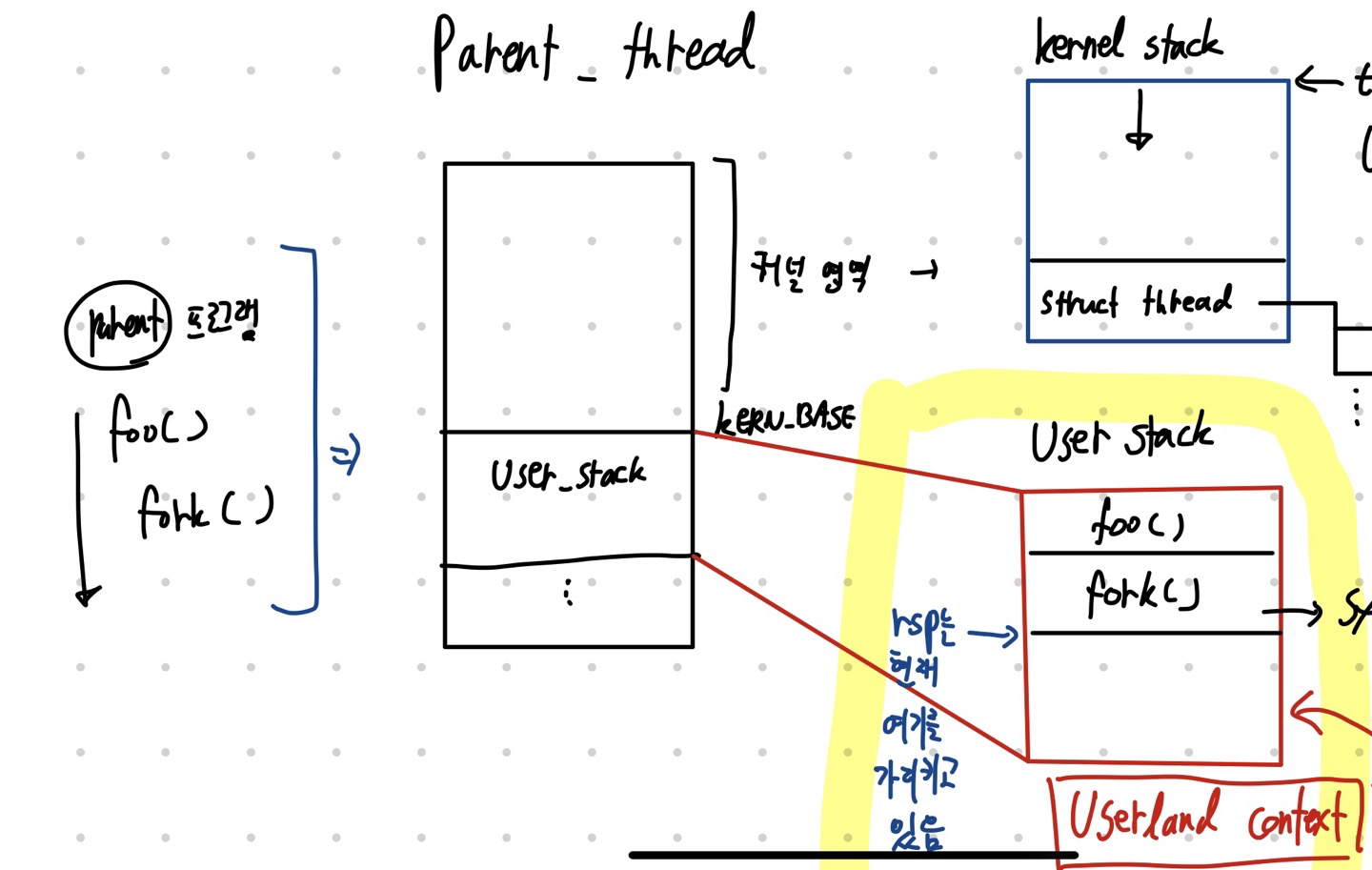 힌트: parent->tf (부모 프로세스 구조체 내 인터럽트 프레임 멤버)는 프로세스의 userland context 정보를 들고 있지 않다.