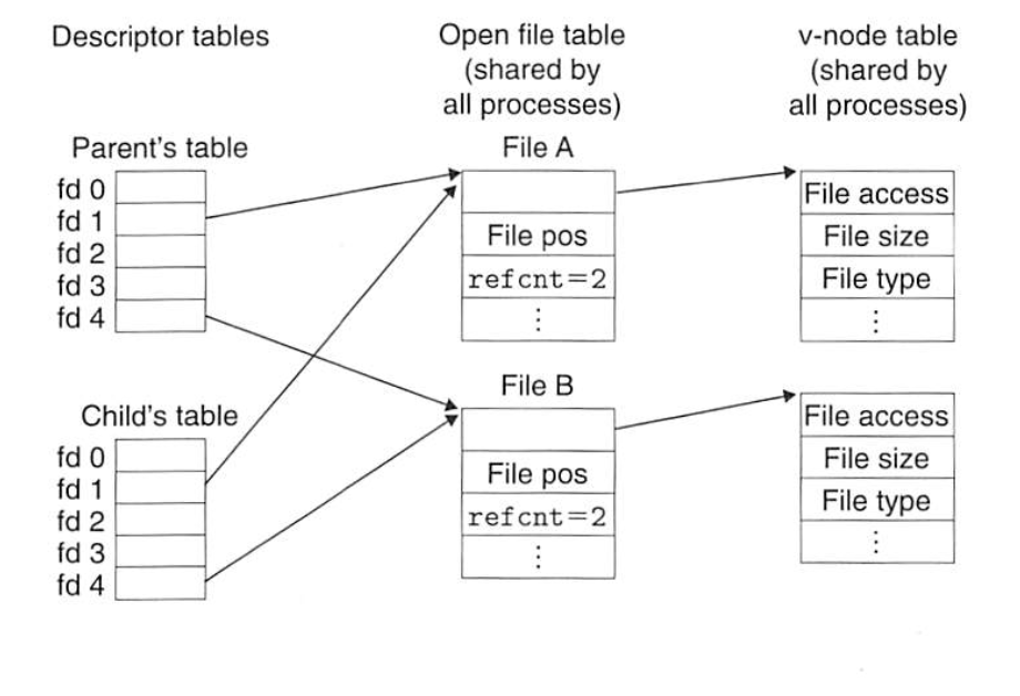 자식 프로세스가 생성되면 부모 프로세스가 가진 것과 동일한 파일 디스크립터 테이블이 생성된다. 여기서 이해를 돕기 위해 운영체제에서 파일 공유하는 방법에 대해 잠깐 알아보자. (CSAPP 10.8장) 커널은 3개의 관련 자료구조를 사용해서 오픈한 파일을 표현한다.