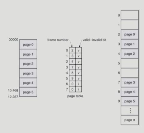 - 이러한 자료구조를 사용함으로 인해 페이지 테이블에는 해당 프레임 번호(물리 메모리 주소)외에도 이 페이지 테이블 엔트리가 유효한 (실제로 물리 메모리가 할당되어 있는)엔트리인지 체크하기 위해 v/i를 나타내는 비트(2가지 정보니까 1비트면 okay)를 사용!