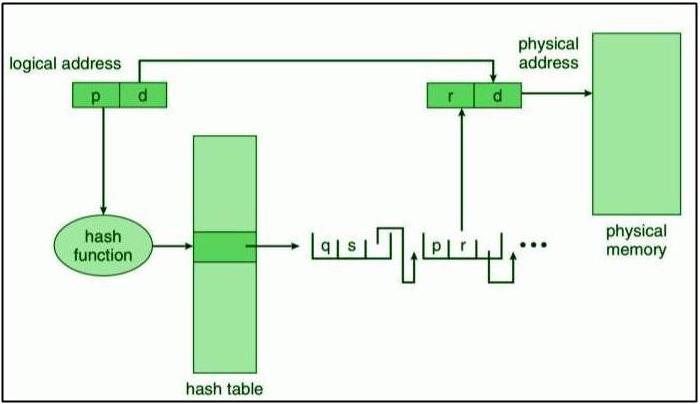 해시 테이블로 구현한 페이지 테이블에서, 가상 주소의 VPN은 해시 테이블로 해시 암호화되어 저장된다. 이 해시 테이블은 32비트 이상의 가상 주소를 다룰 때 주로 사용한다. 해시 테이블 내 각 엔트리는 동일한 위치에 해시된 원소의 연결 리스트를 갖는다. 이는 서로 다른 페이지 번호가 동일한 해시 함수 값을 얻는 충돌(collision)을 피하기 위해서이다. 해시 값은 가상 페이지 번호이며, 가상 페이지 번호는 페이지 오프셋 일부가 아닌 모든 비트이다.