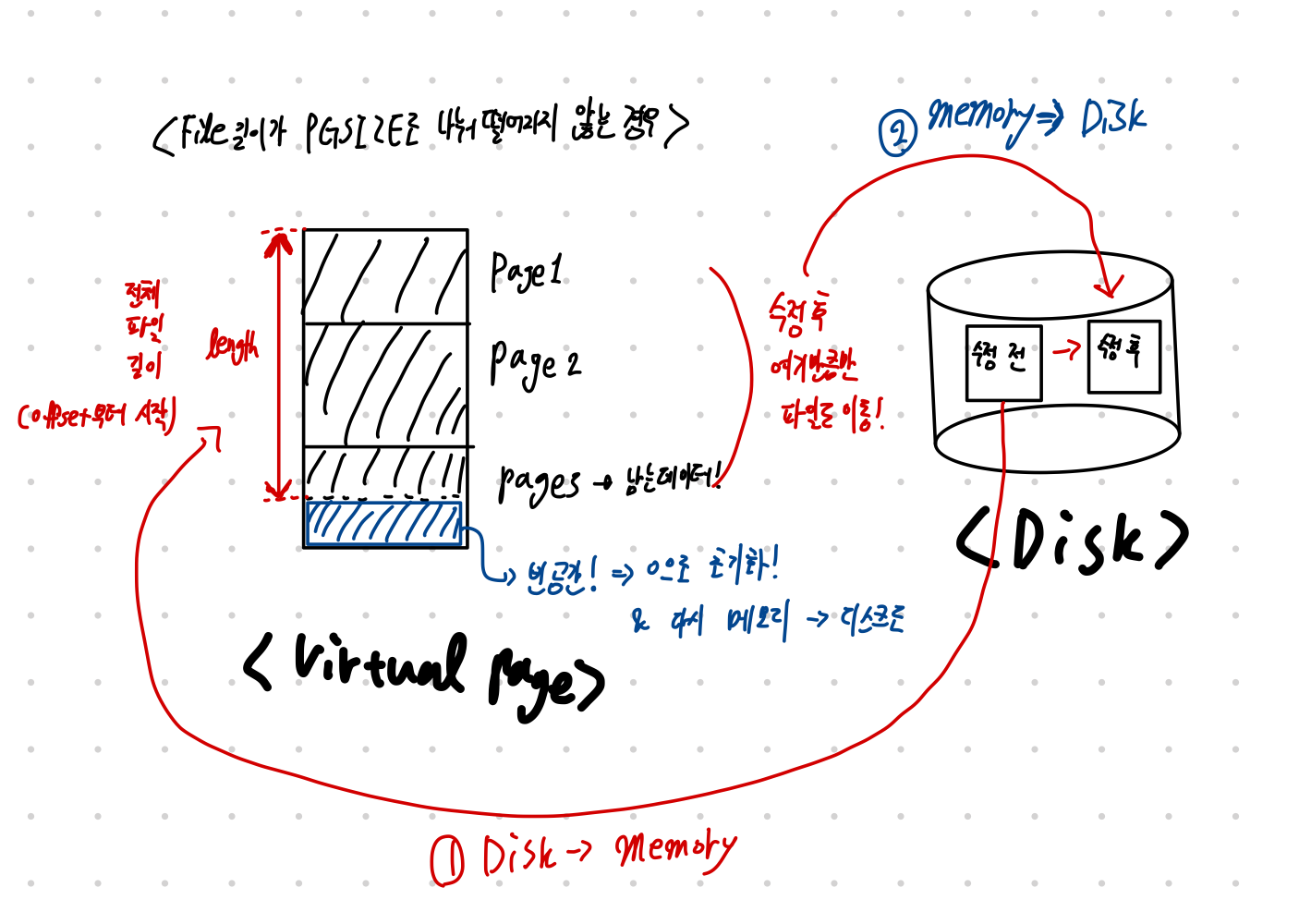 만약 읽어들이는 파일 길이(offset부터 length만큼 읽어오니)가 PGSIZE로 나눠 떨어지지 않는다면 남는 데이터가 발생할 것이다. 이 남는 데이터를 마지막 페이지에 매핑하면 페이지에 빈 공간(아래에서 파란색 영역)이 남는데, 여기에는 0으로 초기화해줄 필요가 있다. 왜냐? 이전에 이 페이지 영역에서 작업했던 기록이 남아있을 수 있는데, 이를 현재 프로세스의 페이지가 접근해서 읽어들이면 보안 상의 문제가 발생하기 때문이다. 따라서 여기는 반드시 0으로 초기화해주고 추후 파일을 작업하는 과정에서 수정 내역이 발생하면 메모리에서 디스크로 파일을 업데이트해줄 텐데, 이때 파란색 영역은 버려진다.