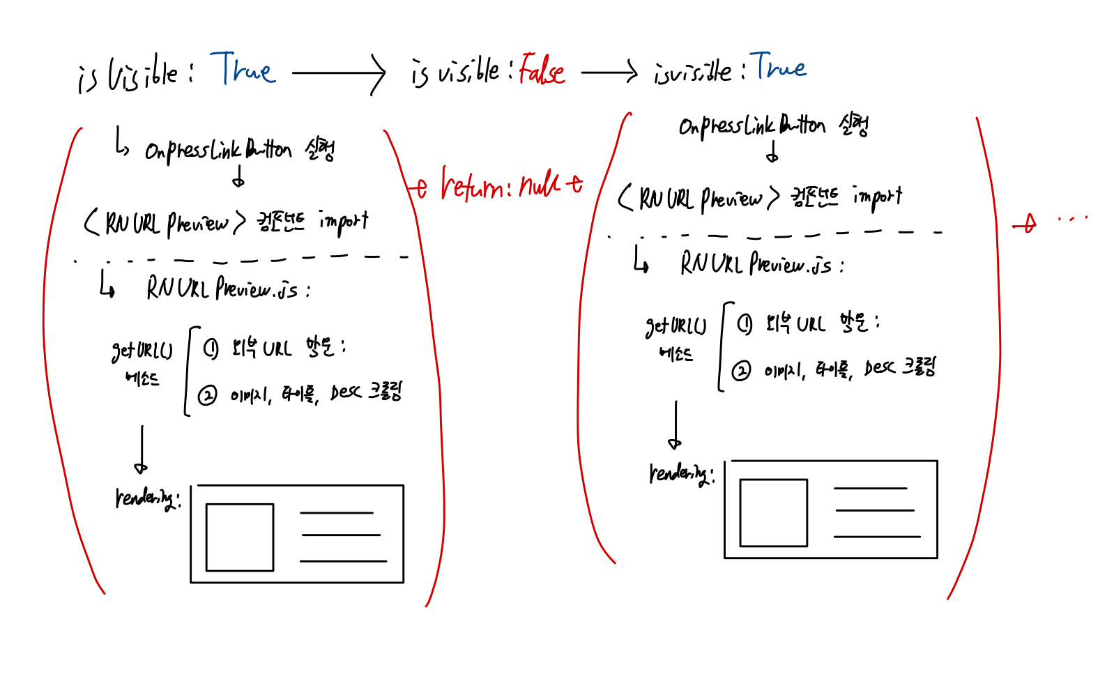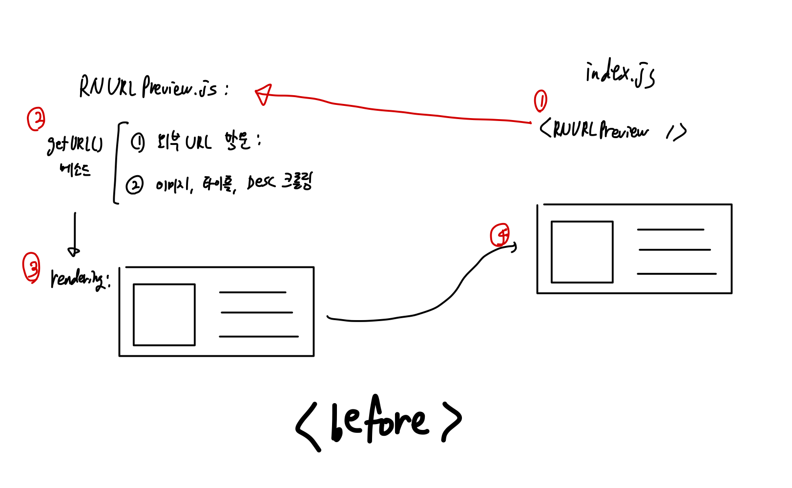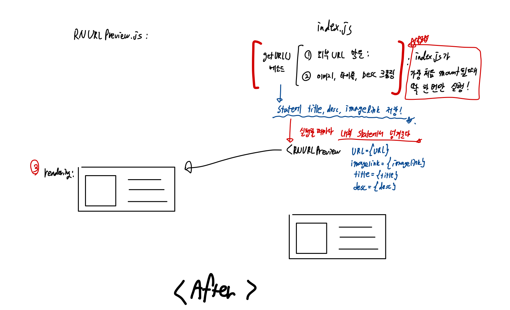 위 도식은 현재 구조이다. index.js에서 <RNUrlPreview /> 컴포넌트를 불러오면 해당 컴포넌트에 대응하는 .js가 실행되어 2,3을 실행해 4로 전달해주는 것. 이를 아래와 같이 변경했다. 처음에 스트리밍 방송에 접속할 때만 외부 url로부터 이미지 링크와 title, desc를 크롤링하고 이를 state에 저장한다.