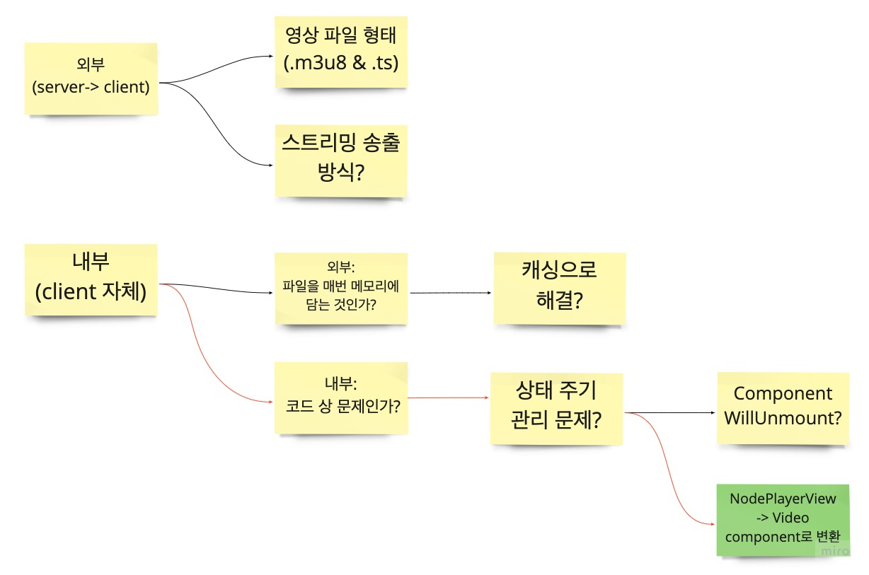 역시 다른 페이지에서는 해당 페이지를 unmount할 때 nodePlayerView.stop()이라는 메소드를 실행해 메모리 상에서 지워주는 것을 확인했다. 반면, 홈 화면에서 다른 화면으로 이동할 때 componentWillUnmount()에서 nodePlayerView.stop() 메소드를 실행해주지 않아 마운트된 nodePlayerView가 메모리에 계속해서 쌓이던 게 원인이었다. 즉, NodePlayerView()를 쓰려면 해당 페이지를 unmount()할 때 항상 componentWillUnmount()에 stop()을 명시적으로 선언해줘야 한다.