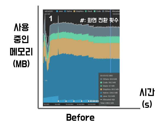 위의 그래프는 앱을 실행하고 로그인 화면 -> 홈화면으로 1회 접속 후 앱을 그대로 둔 상태이다. 그래프 시작 지점에서 뾰족하게 올라오는 사용량은 앱을 처음 실행했을 때의 위치이다. 실행 후 메모리 양이 가파르게 내려가다가 홈 화면 접속과 동시에 반등한다. 그런데 그 이후로는 메모리 사용량이 완만한 감소를 그리다가 유지되고 있음을 확인할 수 있다.