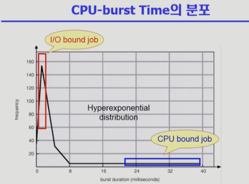 그럼에도 RR을 쓰는 이유가 한 가지 더 있다. 실제 컴퓨팅 환경에서 CPU-burst time의 분포를 살펴보자.