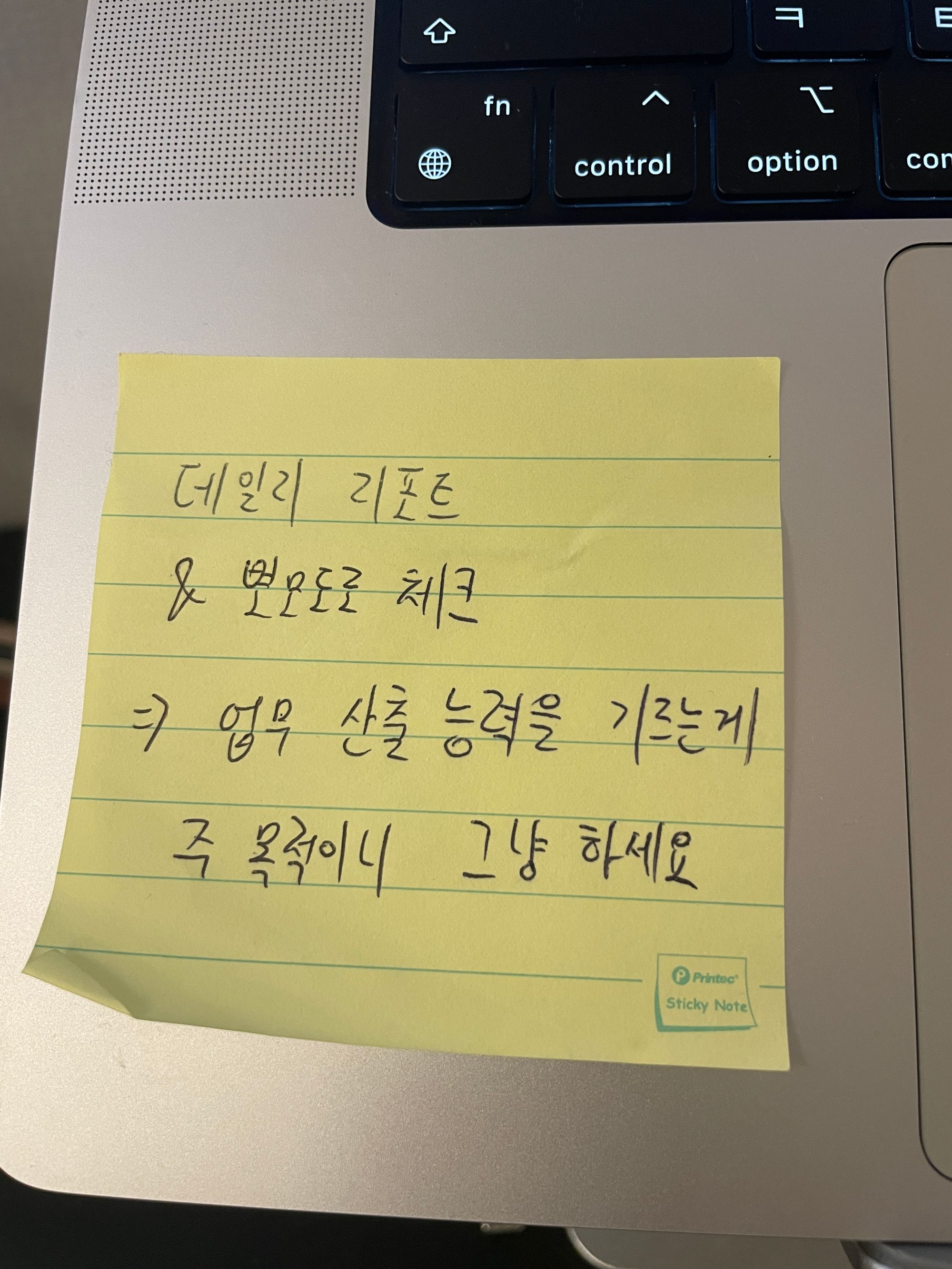 아아주 바람직하다. 역시 환경설정의 힘이란..포스트잇 하나 붙였다고 중간마다 데일리 리포트를 더 의식하면서 쓰게 되더라. 목적이 명확하니 저걸 봤을 때 핑계댈 게 없다. 앞으로도 이렇게만 합시다.