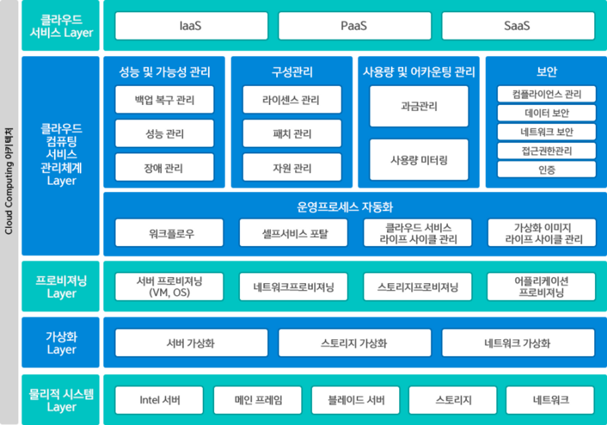 - 클라우드 서비스 계층 - 클라우드 구성 요소가 서비스로서 제공되는 형태 → IaaS, PaaS, SaaS