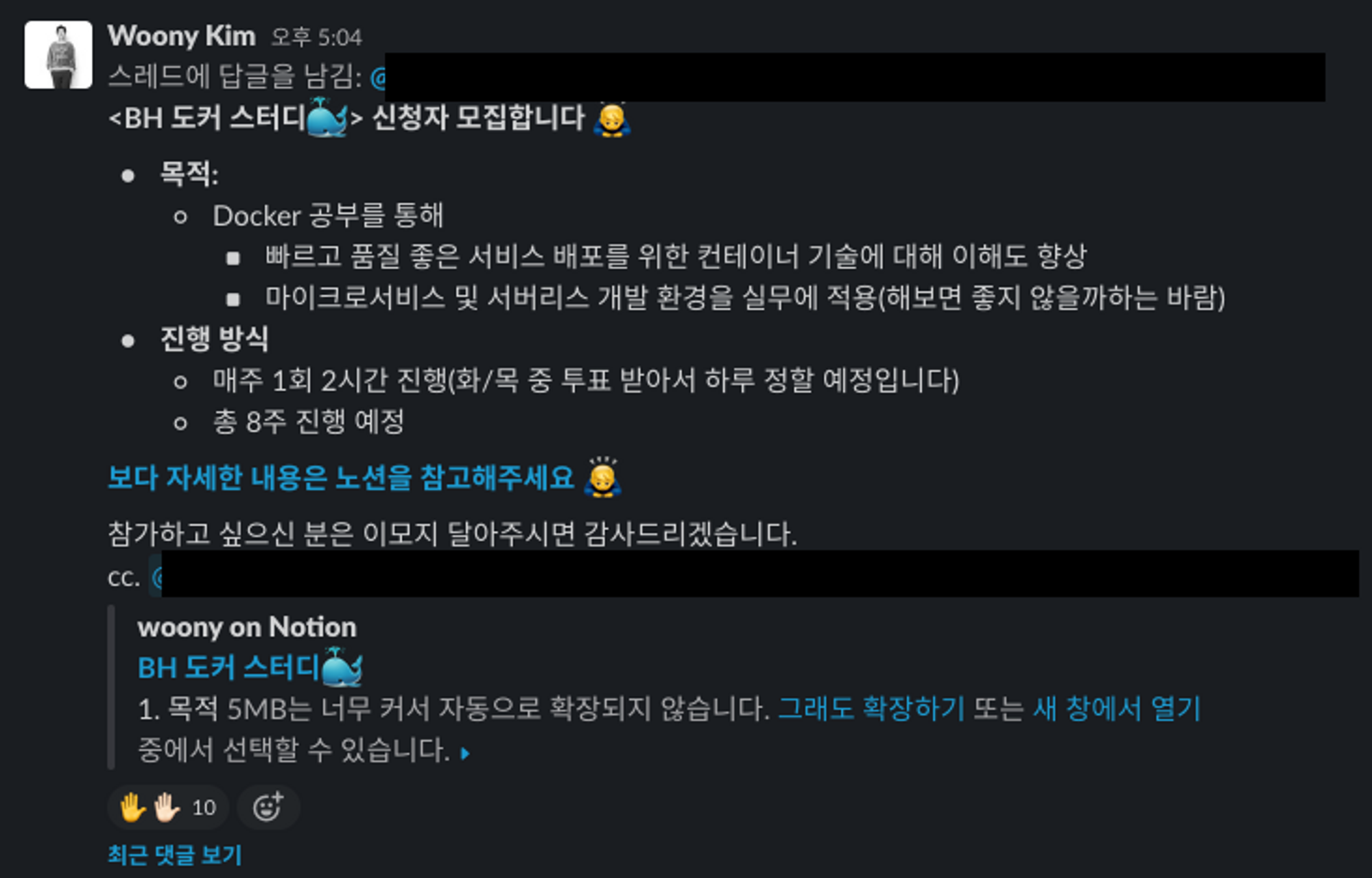 저번 1월 회고에서 언급했듯, 주도적으로 일을 진행하는 내 장점을 살려 BE 팀 내에서뿐만 아니라 FE, QA 등 다른 팀 엔지니어 분들과도 함께 할 수 있는 사내 스터디를 주관해보는 게 어떻냐는 조언을 해주셨다. 실행력 빼면 시체인지라 곧바로 도커 스터디를 시작…하려 했는데 사실 바로 실행하기가 쉽지 않았다. 그도 그럴 것이, 일하면서 배우는 것들을 소화하기도 벅찬 마당에 새로운 스터디를 벌리는 게 맞을까 싶었기 때문이다. 그렇게 고민하기를 3주, 리드님과 1 on 1을 하며 결국 스터디를 진행하기로 결정했다.
