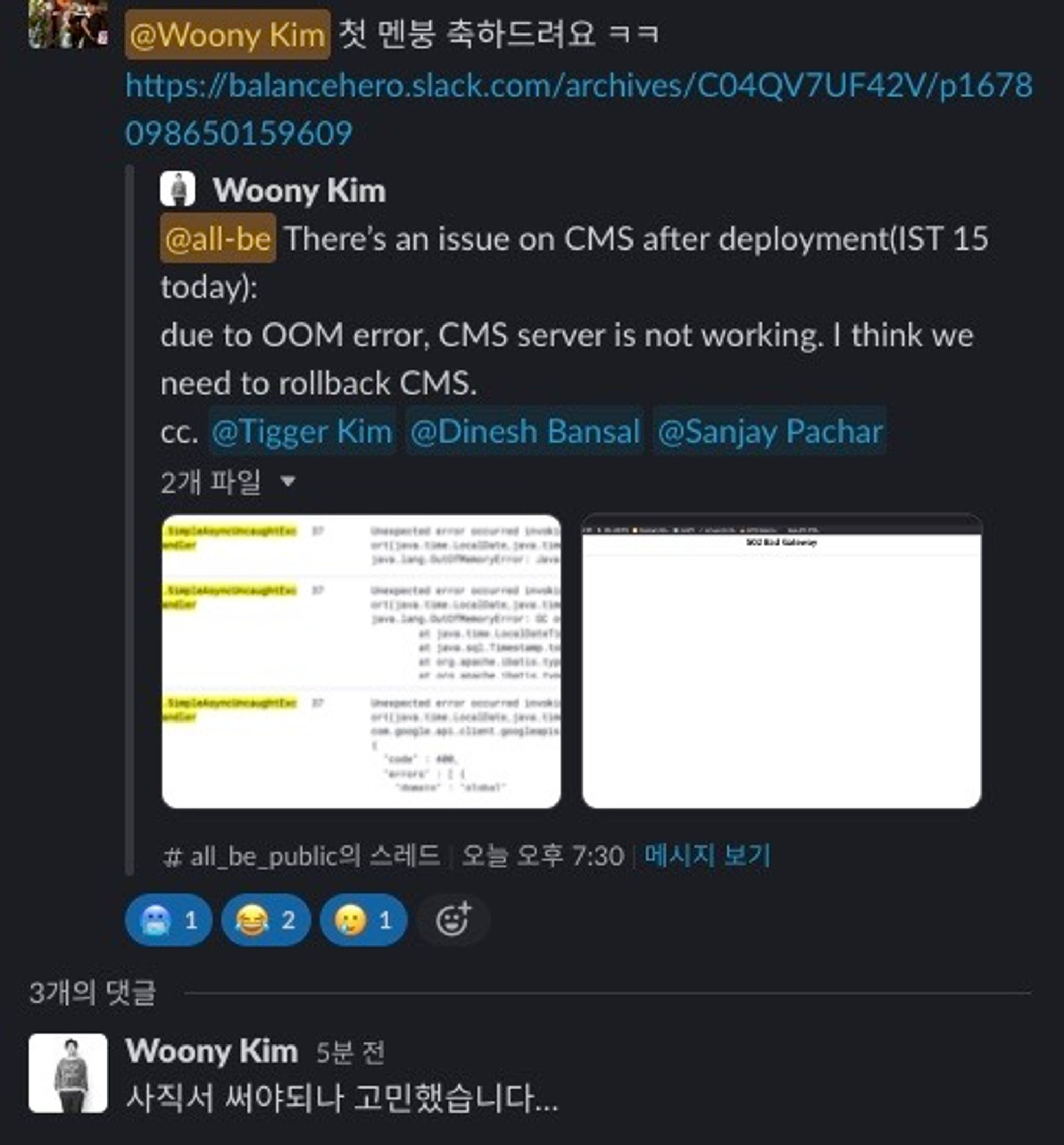 ㅋㅋㅋㅋ지금에야 이걸 웃으면서 적지만.. 당시에는 깜짝 놀라서 허둥지둥 댔던 이슈였다. 작업 다 마무리하고 배포한 뒤 모니터링하는 과정에서 OOM 에러가 터졌다. 당시 시간은 고객 팀이 한창 일할 시간이었고 에러를 터뜨렸던 게 고객 관리 툴 서버였기 때문에 “와…X됐다…”하면서 어찌할 바를 몰랐다. 몇 분 정도 원인 찾으려고 혼자 끙끙대다 도저히 안되겠어서 “이거 롤백해야 될 것 같아요” 하고 슬랙을 보냈다. 그러자 팀 리드가 이슈를 가만 보더니 “너 리포트 만들 때 날짜 범위를 너무 넓게 잡은 거 아냐?” 하고 묻더라. 알고 보니 테스트 서버에서는 데이터 양이 적어서 3개월 치 리포트를 만들어도 고객 데이터가 고작 몇십 개 수준이라 큰 문제가 없었는데 프로덕션에서는 몇십만 개가 잡히니 리포트 만드는 과정에서 메모리가 부족해서 터진 이슈였더라.(즉, 배포 기능 상에서는 문제가 없었음). 리스타트하고 나니 멀끔해졌다.