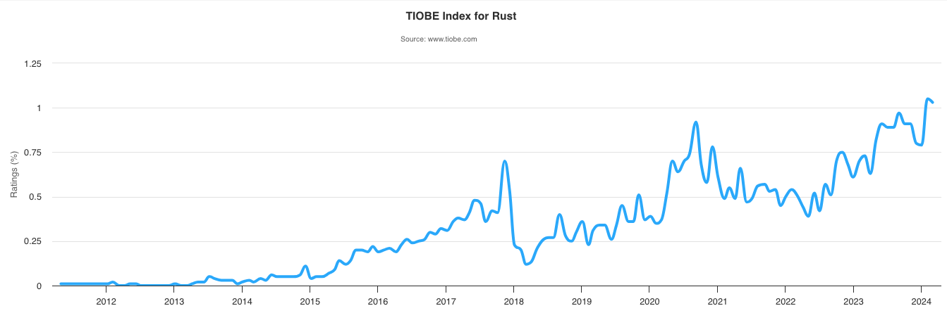 그런 맥락에서, 러스트는 아래 보는 바와 같이 계속해서 인기가 올라가고 있는 신흥 언어임에도 이 언어에 대해 아는 바가 없다보니 새로운 도구 리스트에 추가할 엄두가 나지 않았다. 그러던 차에 서평단에 당첨됐으니 얼마나 좋겠나.(정작 책을 이제야 펼쳐보는 게 함정이지만..)