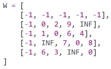 n = len(w)-1인데, 여기서 n은 전체 도시의 개수를 의미한다. 왜 w에서 1을 빼냐면, 본 강의에서 input으로 받는 w의 모양새는 아래와 같기 때문이다. 0부터 숫자를 세는 특성을 감안해 계산을 편하게 하기 위해 테두리에 0열, 0행에 각각 -1을 둘러놨다. 이러면 w[i][j]에서 i, j가 도시 넘버와 일치하게 된다. (만약 W를 4 X 4로 하면 수식을 쓸 때는 w[i+1][j+1]로 1씩 더해줘야 함)