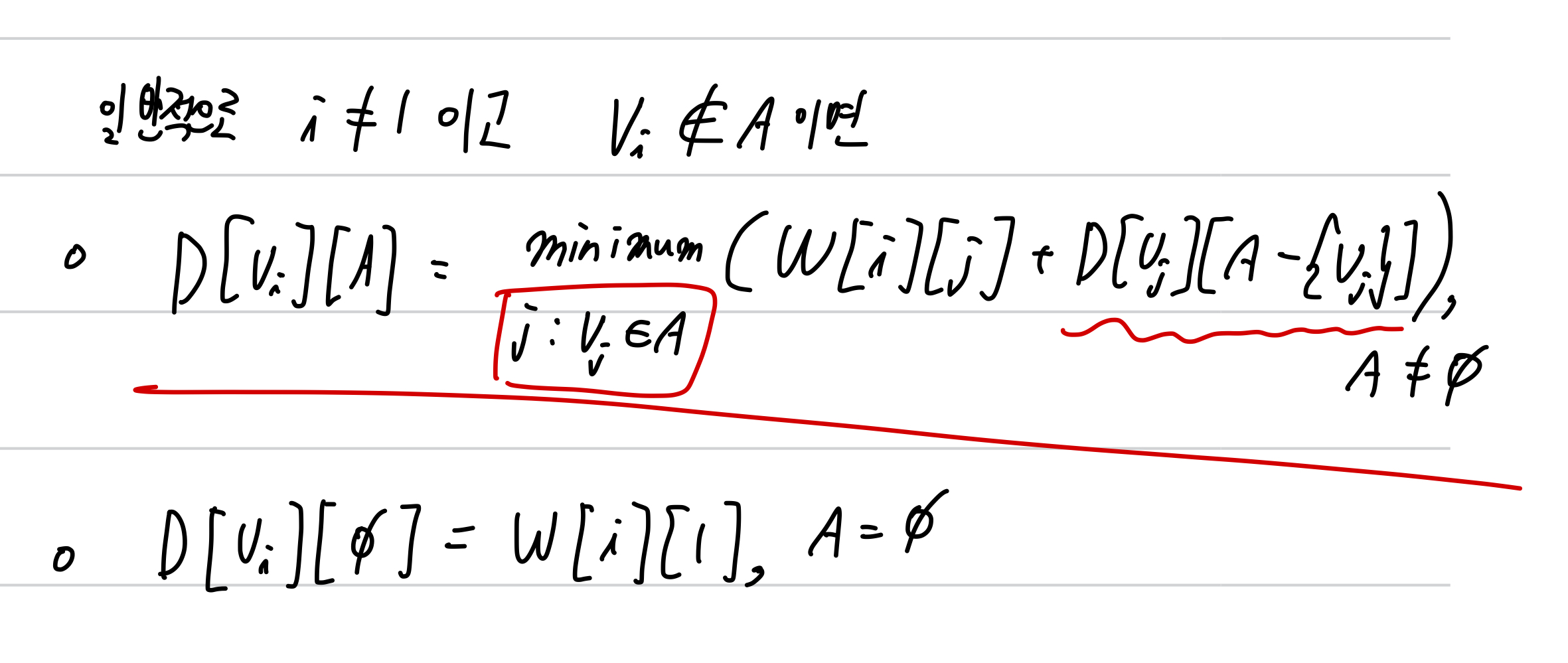 D[i][0] = W[i][1] #D[i][0]에서 [0]은 A가 공집합임을 뜻함 => W[i][1]은 vi에서 v1으로 갈때의 비용이니