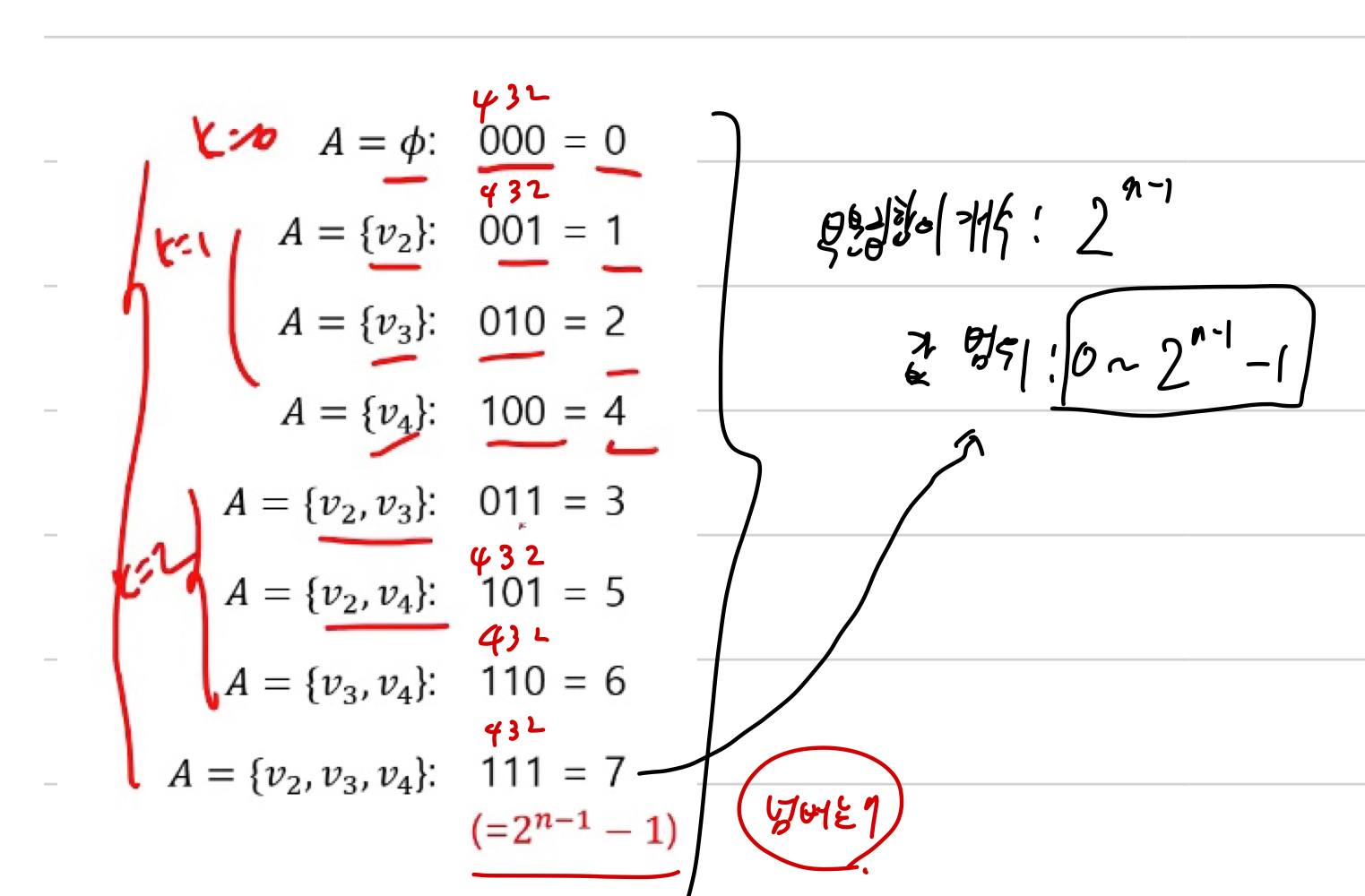 for A in range(1, size): #1부터 2**(n-1)-1까지 공집합을 제외한 모든 부분집합 (비트로 바꾸면 A 안에 뭐 들어있는지 체크 가능)