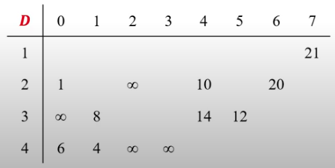 D[i][0] = w[i][1] #A에 아무 도시도 없다면 모든 경로를 다 지나왔다는 뜻이므로 Vi에서 최종 도시인 V1으로 가면 됨. 따라서 D의 0열에서 모든 행은 Vi=>V1으로 가는 비용을 넣는다.