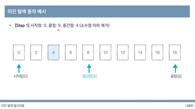 - 시작점과 끝점을 전체 리스트의 양 끝으로 설정한 다음, 중간점을 찾는다.