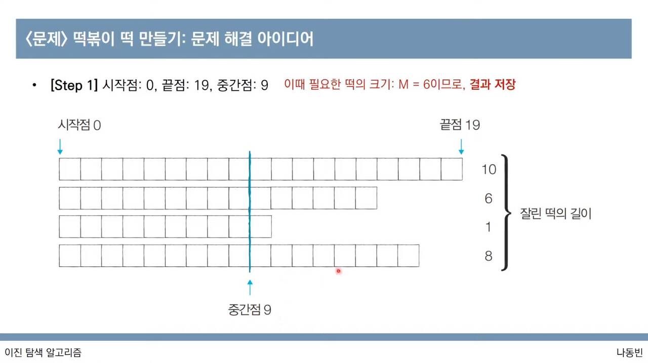 - '현재 이 높이로 자르면 조건을 만족할 수 있는가?'를 확인한 뒤에, 조건의 만족 여부("예" 혹은 "아니오")에 따라서 탐색 범위를 좁혀서 해결할 수 있다.