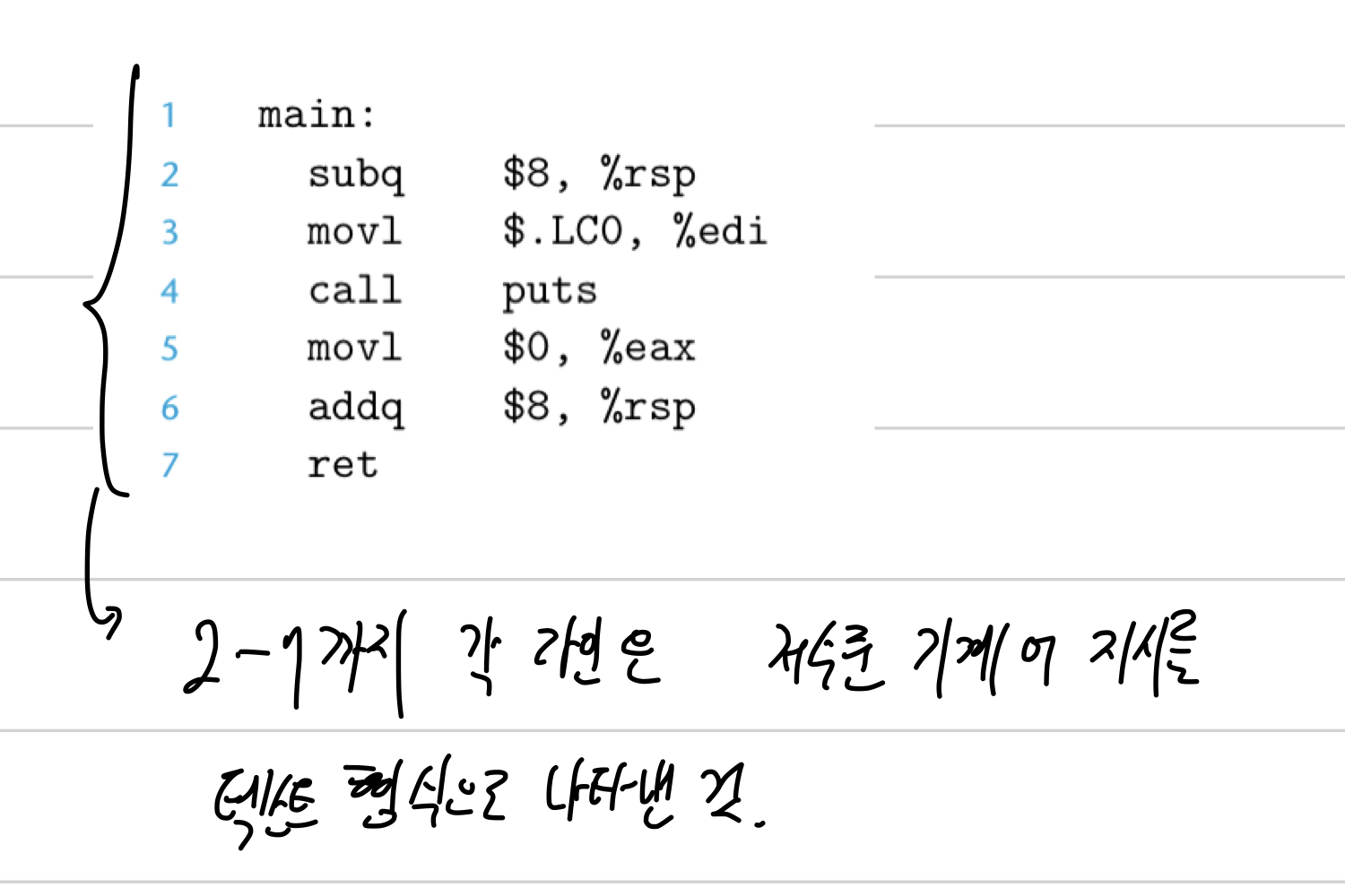 컴파일러(cc1)은 hello.i를 텍스트 파일 hello.s로 한 번 더 번역한다. 이 때, 번역하는 언어는 어셈블리어로 된 프로그램을 포함한다. 이 프로그램은 function main을 어셈블리어로 포함하는데, 아래 이미지의 function main에 대해 라인 2부터 라인 7까지는 저수준 기계어 지시사항을 텍스트 형식으로 나타낸 것이다.